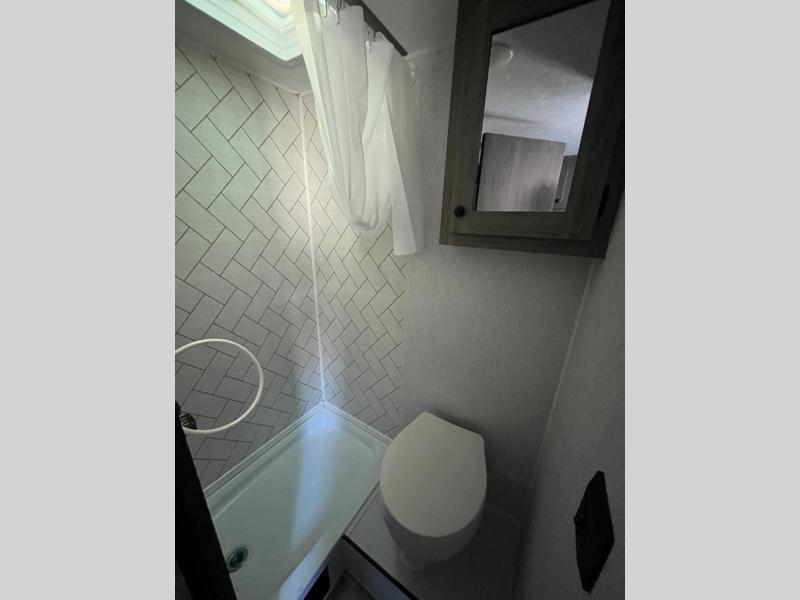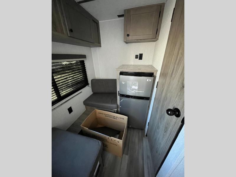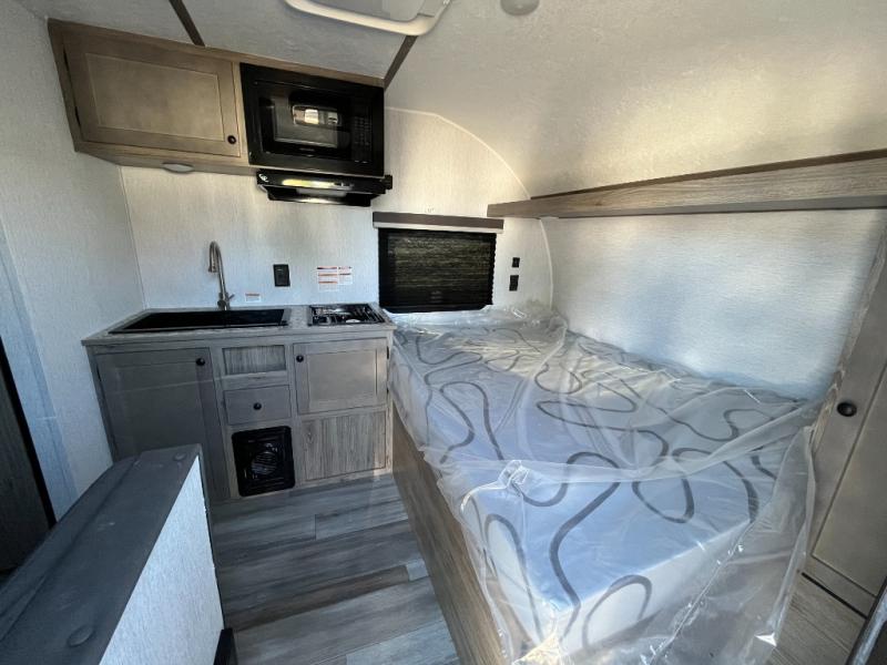 This lightweight travel trailer is perfect for two to three campers each night! You will sleep soundly on the front 54" x 74" bed with an overhead shelf and a closet for your things. Whip up eggs and bacon on the two burner cooktop in the morning, then dine at the 30" booth dinette. This can also double as sleeping space for an overnight guest or two little ones! The private bath with a 24" x 32" shower and a toilet will let you freshen up each day, and the double sink in the kitchen provides a place to wash your hands and teeth at night. You will also appreciate having a 4.3 cu. ft. 12V refrigerator to keep your food fresh and a 5K BTU wall A/C to keep you comfortable all summer long!