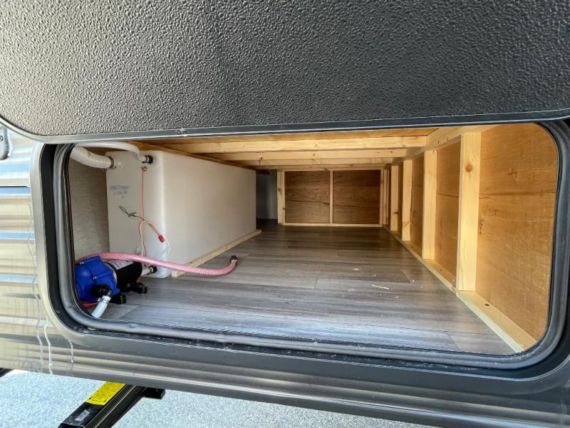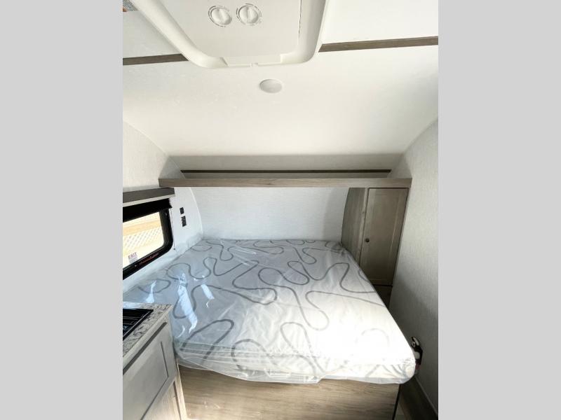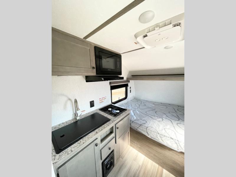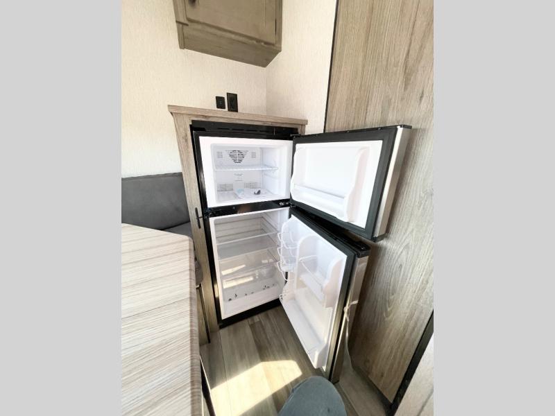 This lightweight travel trailer is perfect for two to three campers each night! You will sleep soundly on the front 54" x 74" bed with an overhead shelf and a closet for your things. Whip up eggs and bacon on the two burner cooktop in the morning, then dine at the 30" booth dinette. This can also double as sleeping space for an overnight guest or two little ones! The private bath with a 24" x 32" shower and a toilet will let you freshen up each day, and the double sink in the kitchen provides a place to wash your hands and teeth at night. You will also appreciate having a 4.3 cu. ft. 12V refrigerator to keep your food fresh and a 5K BTU wall A/C to keep you comfortable all summer long!