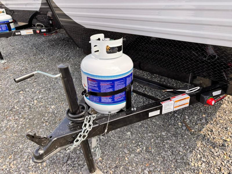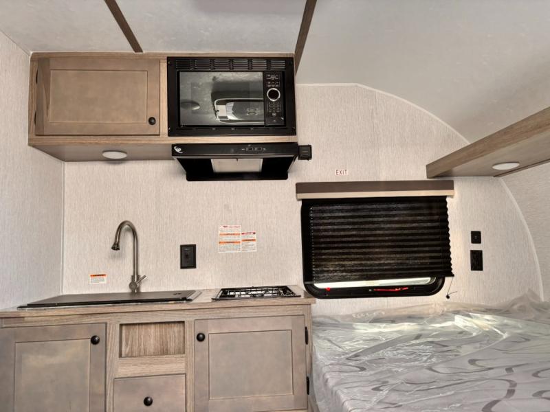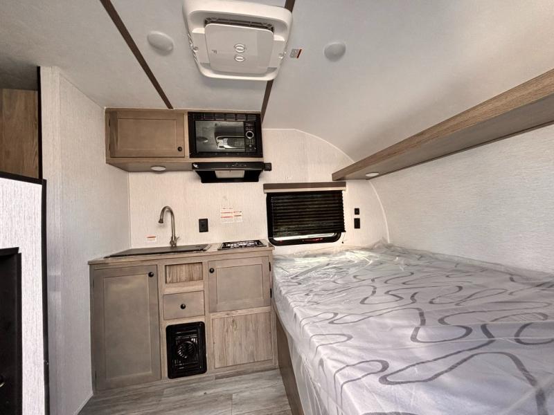 This lightweight travel trailer is perfect for a family of four! You will sleep soundly on the front 54" x 74" bed with an overhead shelf and a closet for your things, and there is a set of bunks along the curbside to the left of the entry door for two more. The top bunk is 24" x 68" with a bottom bunk that is 30" x 68. You can easily cook meals using the two burner cooktop and the double sink is great for cleaning up. The private bath with a 24" x 32" shower and a toilet will let you freshen up each day, and the double sink in the kitchen provides a place to wash your hands and brush your teeth at night. You will also appreciate having a 4.3 cu. ft. 12V refrigerator to keep your food fresh and a 5K BTU wall A/C to keep you comfortable all summer long!