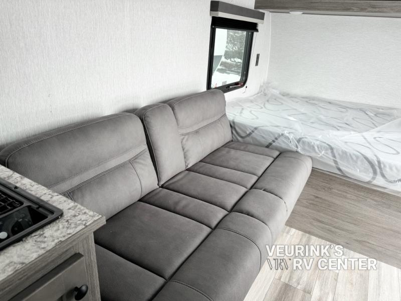 You'll love camping in this cozy trailer! Once you arrive at the campground, you can set up the 9' power awning and head inside to unpack your bags. After you've stretched your legs on a hike, the rear corner private bath with a 24" x 32" shower and a toilet will let you freshen up. You'll find the kitchen in the other rear corner, complete with a two burner cooktop, a double sink, plus counter space to prep meals. When you're ready for some shut-eye, the front 54" x 74" full-size bed will provide a great night's rest, while your guest takes the 56" jiffy sofa!