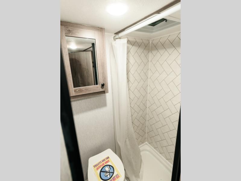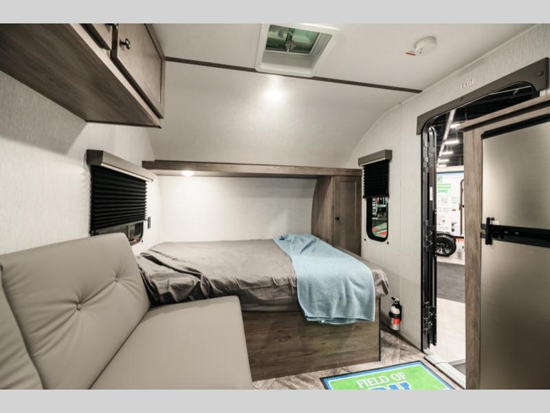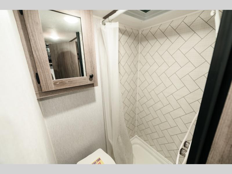 You'll love camping in this cozy trailer! Once you arrive at the campground, you can set up the 9' power awning and head inside to unpack your bags. After you've stretched your legs on a hike, the rear corner private bath with a 24" x 32" shower and a toilet will let you freshen up. You'll find the kitchen in the other rear corner, complete with a two burner cooktop, a double sink, plus counter space to prep meals. When you're ready for some shut-eye, the front 54" x 74" full-size bed will provide a great night's rest, while your guest takes the 56" jiffy sofa!