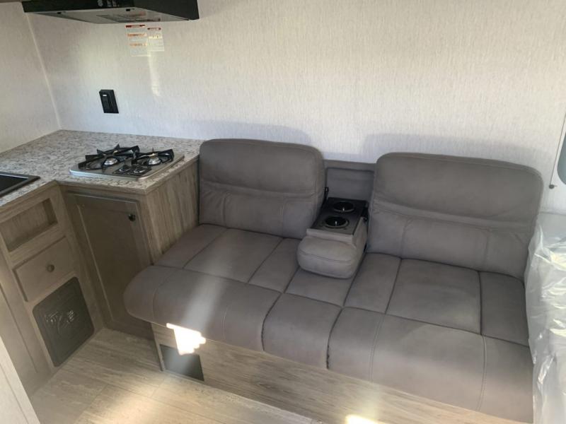 You'll love camping in this cozy trailer! Once you arrive at the campground, you can set up the 9' power awning and head inside to unpack your bags. After you've stretched your legs on a hike, the rear corner private bath with a 24" x 32" shower and a toilet will let you freshen up. You'll find the kitchen in the other rear corner, complete with a two burner cooktop, a double sink, plus counter space to prep meals. When you're ready for some shut-eye, the front 54" x 74" full-size bed will provide a great night's rest, while your guest takes the 56" jiffy sofa!