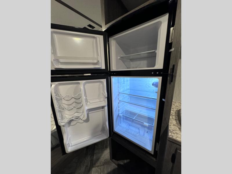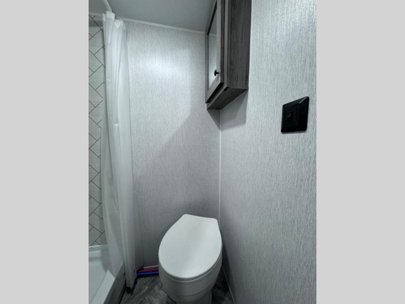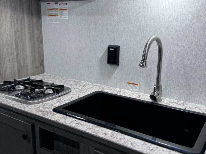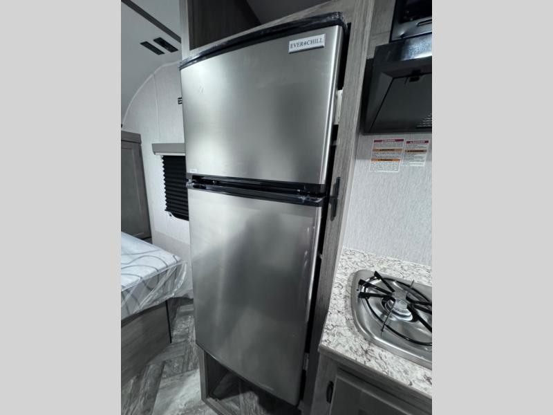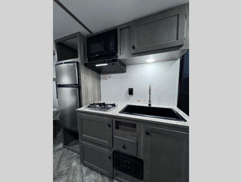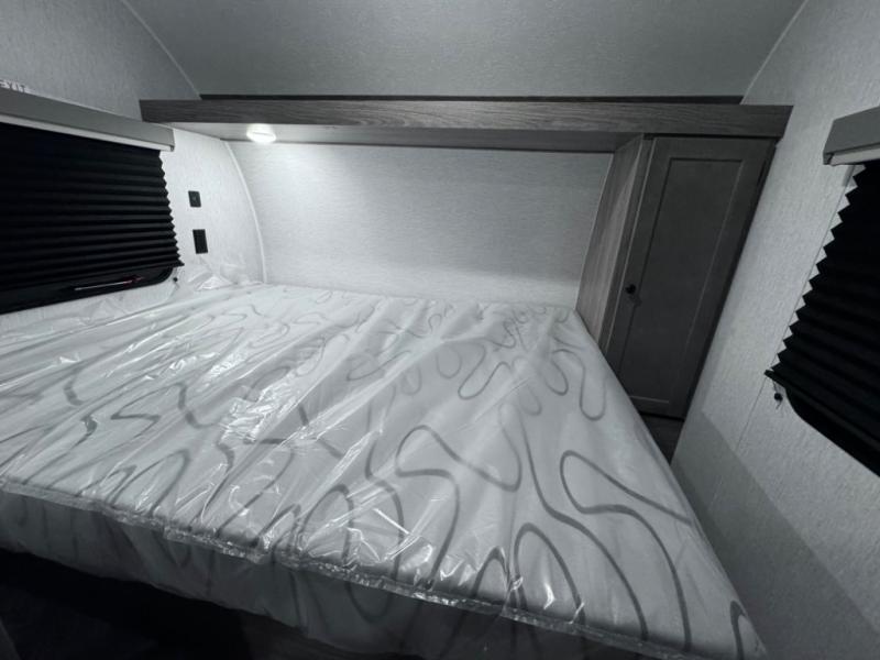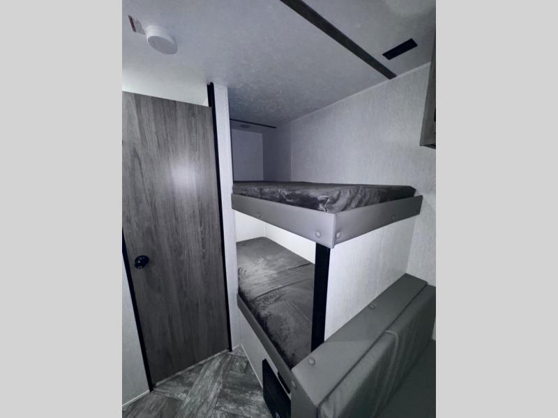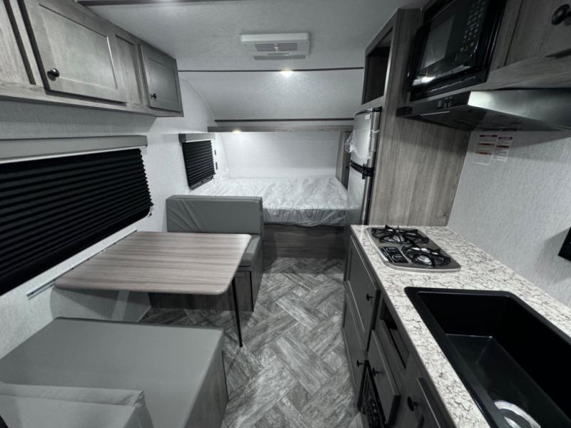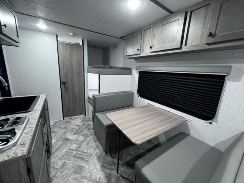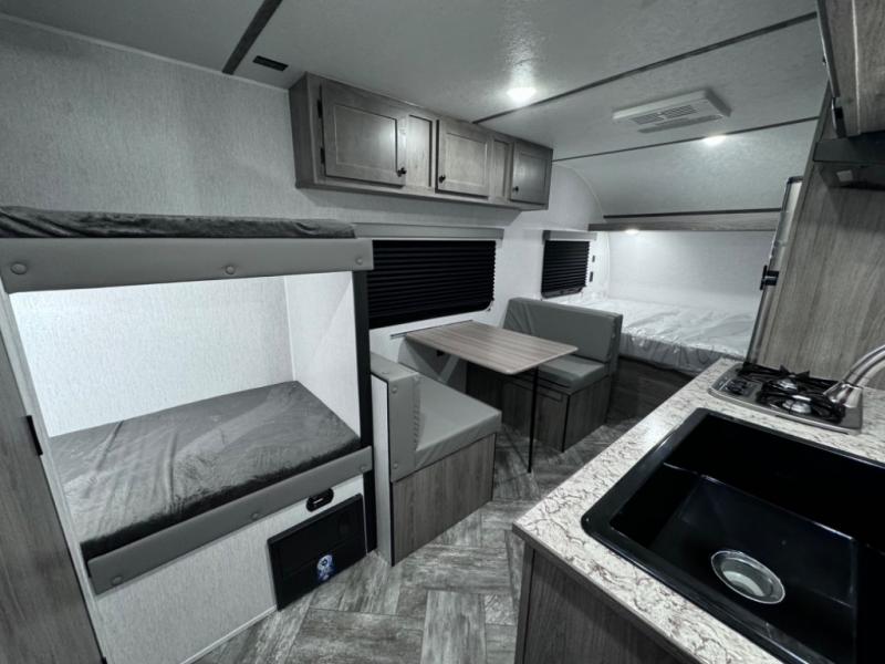 If you've been wanting to ditch that old tent and upgrade to a travel trailer, this easy-to-tow unit is the one! You will have a front RV queen bed to sleep on instead of an air mattress or cot, and there are even bunk beds in the back for the little ones. The bathroom includes a shower and a toilet so you don't have to use the camp's facilities in the middle of the night, and there is a closet plus a shelf by the front bed for storage space. You will love having a kitchen to cook meals in that include a two burner stove, a 4.3 cu. ft. 12V refrigerator, plus a double sink for easy clean up. When dinner is ready, you can dine at the 30" booth dinette and play a game of cards when everything is cleaned up!