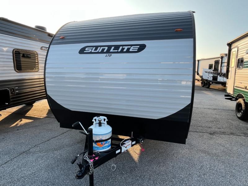 Each Sun Lite LTD travel trailer by Sunset Park RV is made with flexibility in mind. These lightweight models weigh under 3,000 lbs. for easy towing, and they offer best-in class interior storage for all your belongings. There are wood framed sidewalls, .024" aluminum siding, plus 3/8" fully walkable roof decking for added durability. The spring-leaf Dexter axles and radial tires will make towing easier than ever, and the front and rear stabilizer jacks will provide a secure foundation when you're set up at the campground. A 100W solar kit with a controller is also included, along with a 20 lb. LP tank, and a power awning for protection against the elements. Inside, you'll find a power vent in the bathroom, LED lights, USB ports, and cable/satellite hookups. And the LTD Appliance Package also comes standard with a 12V refrigerator, a two burner stove, a DSI gas water heater, plus a 5k BTU A/C and a 16k BTU furnace!