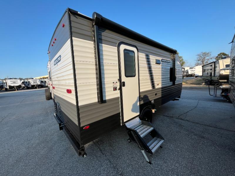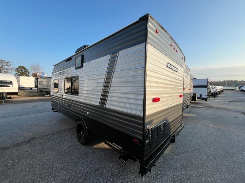 If you've been wanting to ditch that old tent and upgrade to a travel trailer, this easy-to-tow unit is the one! You will have a front RV queen bed to sleep on instead of an air mattress or cot, and there are even bunk beds in the back for the little ones. The bathroom includes a shower and a toilet so you don't have to use the camp's facilities in the middle of the night, and there is a closet plus a shelf by the front bed for storage space. You will love having a kitchen to cook meals in that include a two burner stove, a 4.3 cu. ft. 12V refrigerator, plus a double sink for easy clean up. When dinner is ready, you can dine at the 30" booth dinette and play a game of cards when everything is cleaned up!