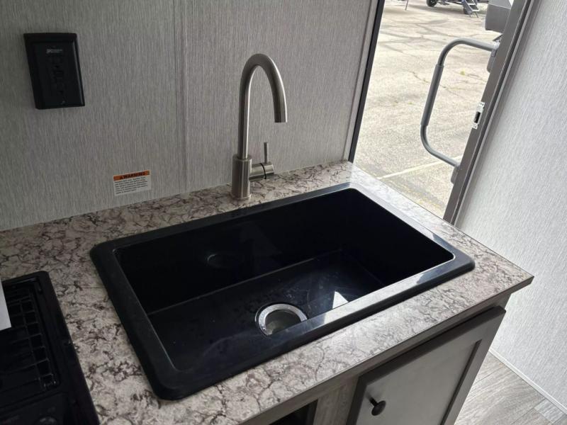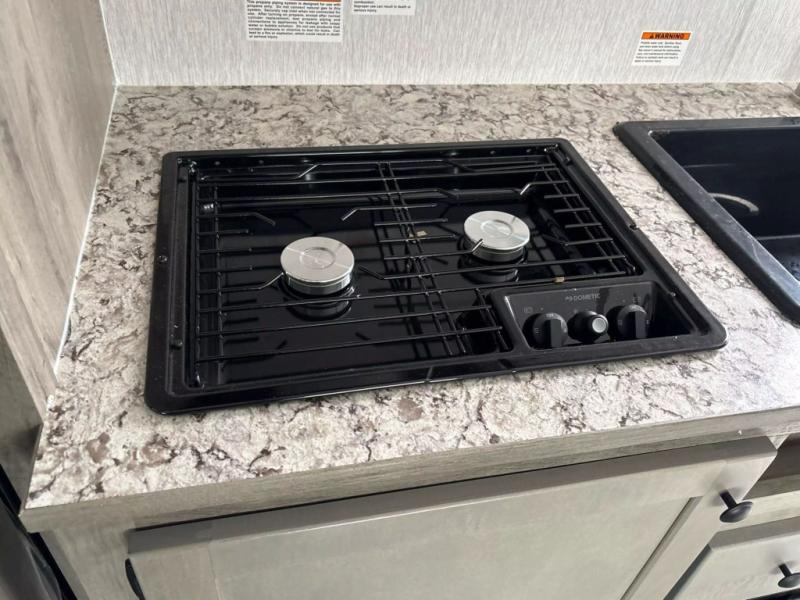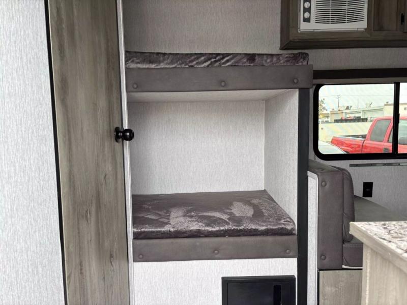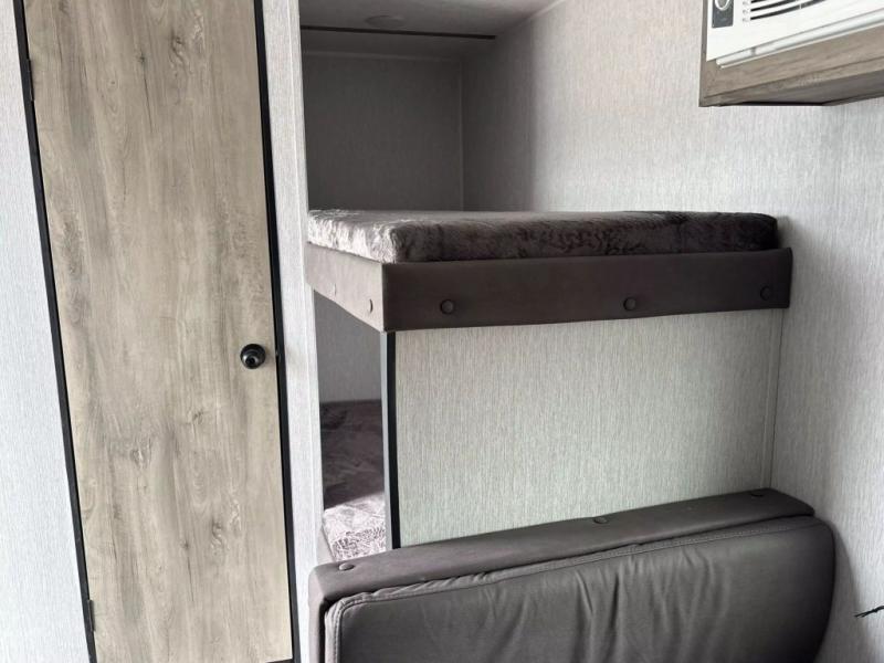 If you've been wanting to ditch that old tent and upgrade to a travel trailer, this easy-to-tow unit is the one! You will have a front RV queen bed to sleep on instead of an air mattress or cot, and there are even bunk beds in the back for the little ones. The bathroom includes a shower and a toilet so you don't have to use the camp's facilities in the middle of the night, and there is a closet plus a shelf by the front bed for storage space. You will love having a kitchen to cook meals in that include a two burner stove, a 4.3 cu. ft. 12V refrigerator, plus a double sink for easy clean up. When dinner is ready, you can dine at the 30" booth dinette and play a game of cards when everything is cleaned up!