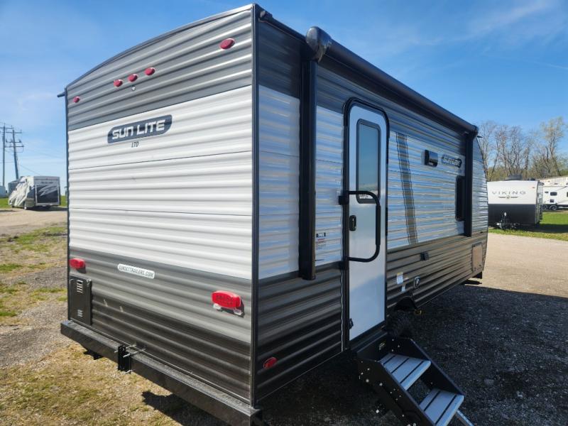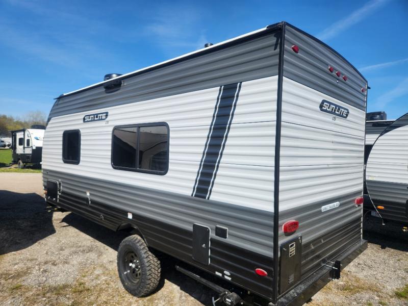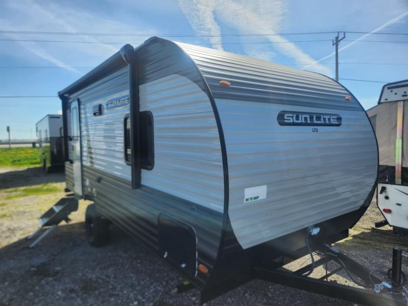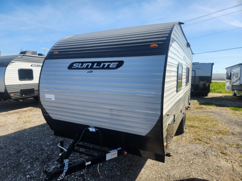 The perfect couple's trailer is waiting for you with this Sun Lite LTD! The front RV queen bed will provide a great night's rest after a day of hiking outdoors, and the full rear bath will let you clean up each day. There is a booth dinette where you can dine at each day, and even let another guest sleep over if needed. You'll also find a two burner stove to make meals, a double sink to clean up, and a 4.3 cu. ft. 12V refrigerator for leftovers! What's not to love about this travel trailer?!