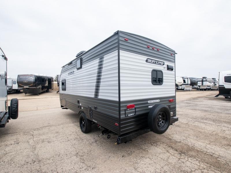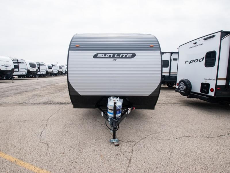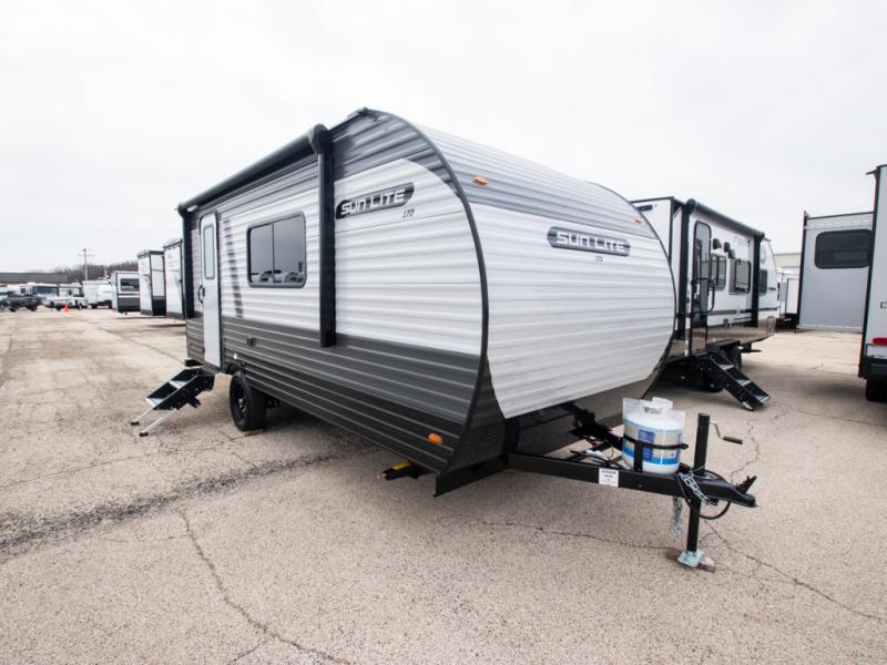 Each Sun Lite LTD travel trailer by Sunset Park RV is made with flexibility in mind. These lightweight models weigh under 3,000 lbs. for easy towing, and they offer best-in class interior storage for all your belongings. There are wood framed sidewalls, .024" aluminum siding, plus 3/8" fully walkable roof decking for added durability. The spring-leaf Dexter axles and radial tires will make towing easier than ever, and the front and rear stabilizer jacks will provide a secure foundation when you're set up at the campground. A 100W solar kit with a controller is also included, along with a 20 lb. LP tank, and a power awning for protection against the elements. Inside, you'll find a power vent in the bathroom, LED lights, USB ports, and cable/satellite hookups. And the LTD Appliance Package also comes standard with a 12V refrigerator, a two burner stove, a DSI gas water heater, plus a 5k BTU A/C and a 16k BTU furnace!