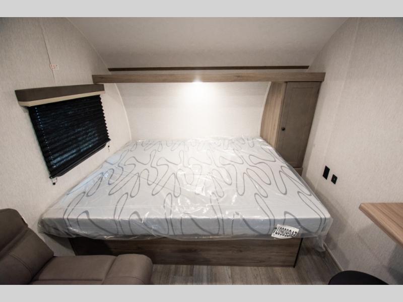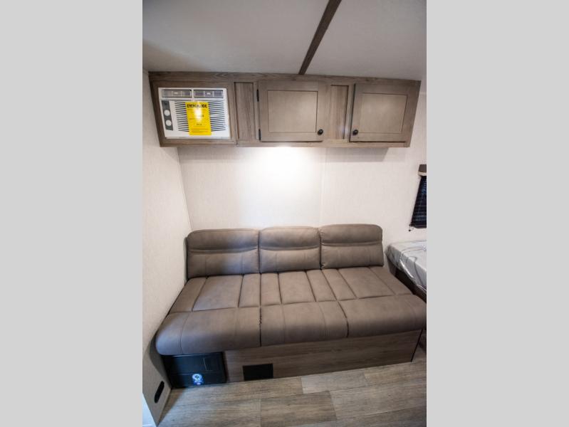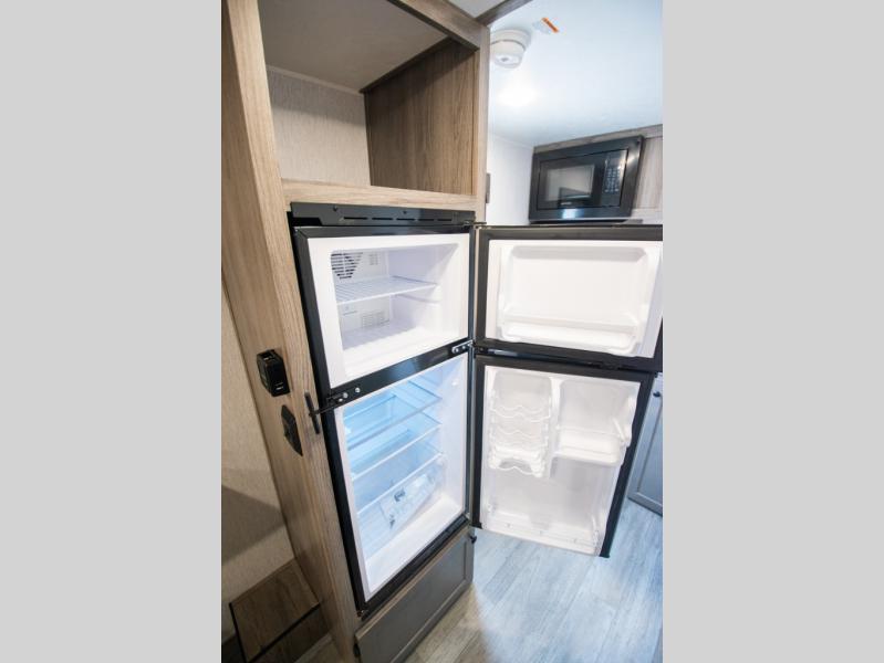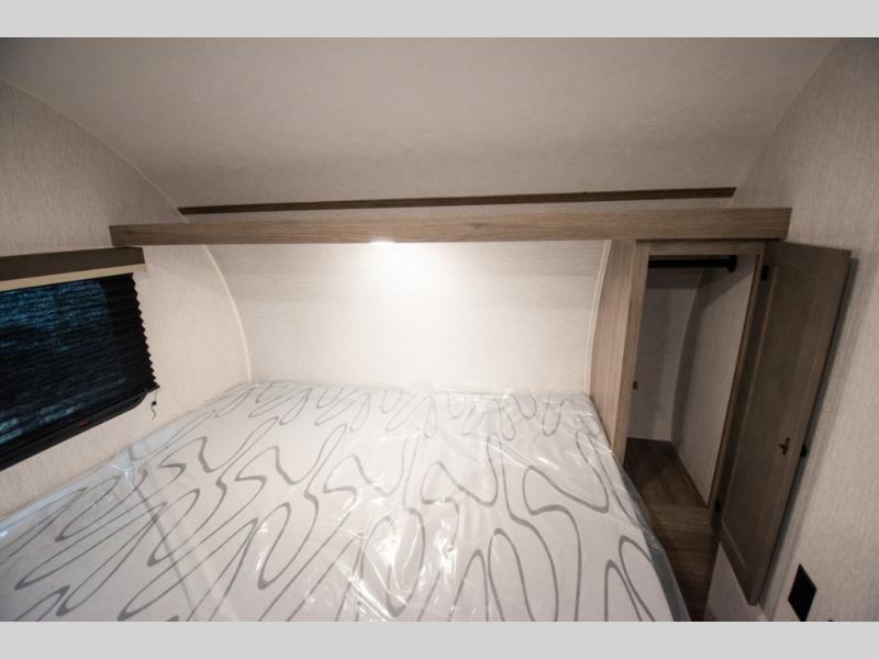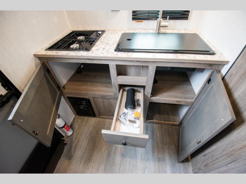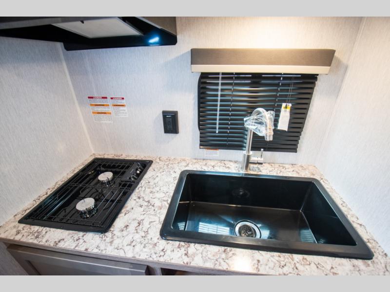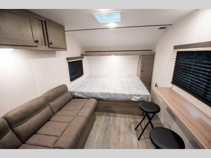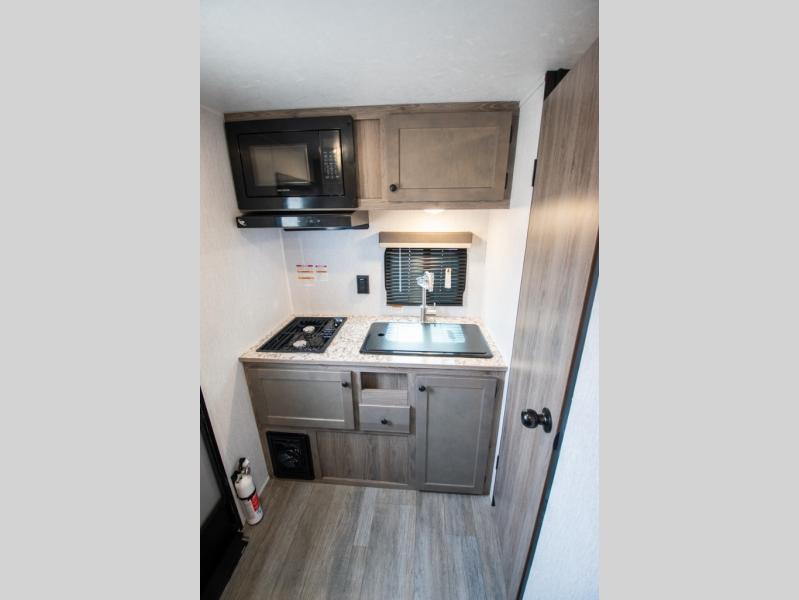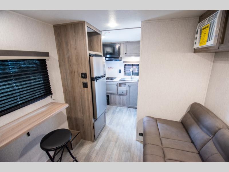 You're going to love every minute spent in this cozy travel trailer for three happy campers! The rear corner kitchen includes a two burner stove and double sink for easy clean up, and the full bath is in the other rear corner. This model also includes a 4.3 cu. ft. 12V refrigerator and a bar top where you can enjoy your meals together each day. The 68" jiffy sofa provides a place to relax in the evenings, and an overnight guests can make their bed here at night. You will find the RV queen bed to be accommodating, especially with its shelf for your personal belongings and a closet for clothes!