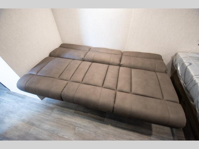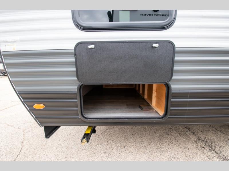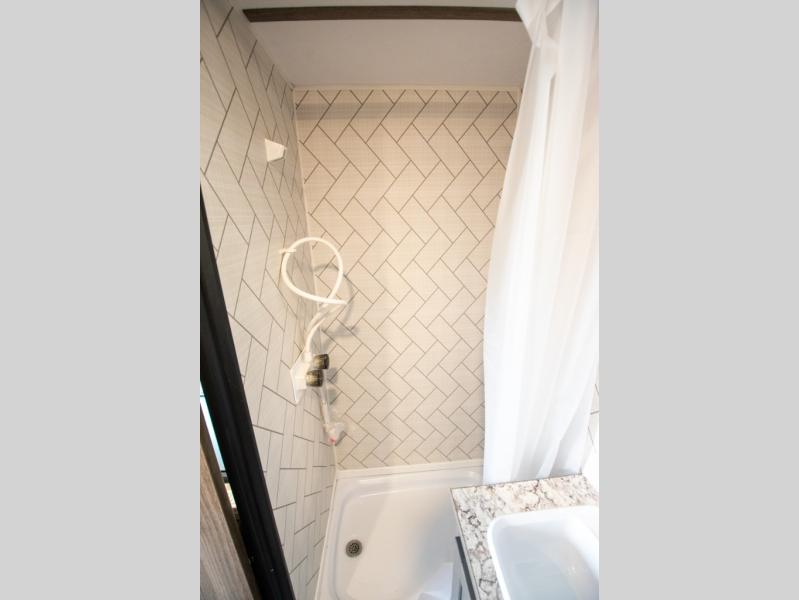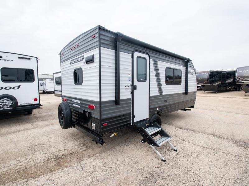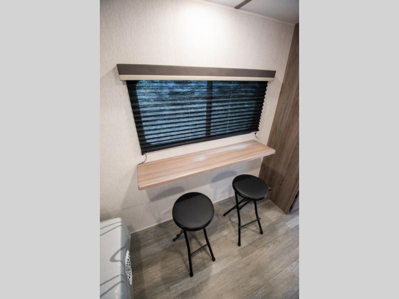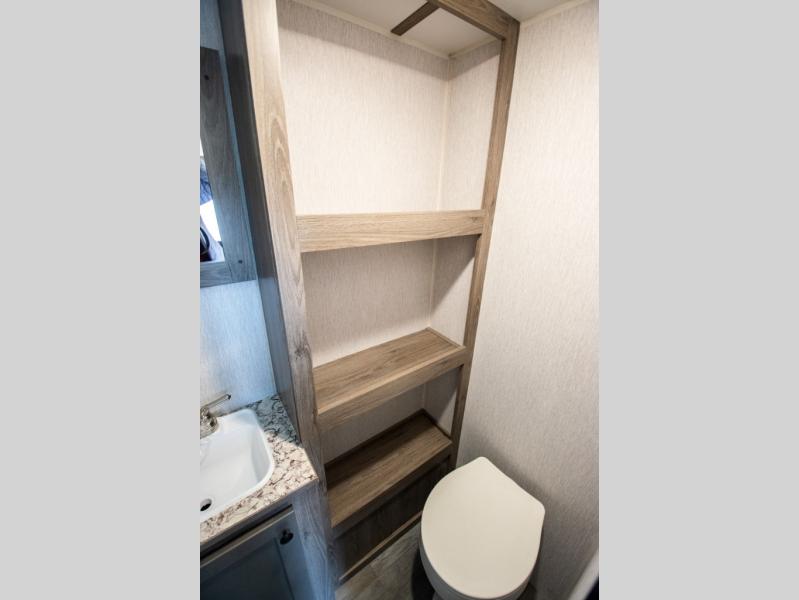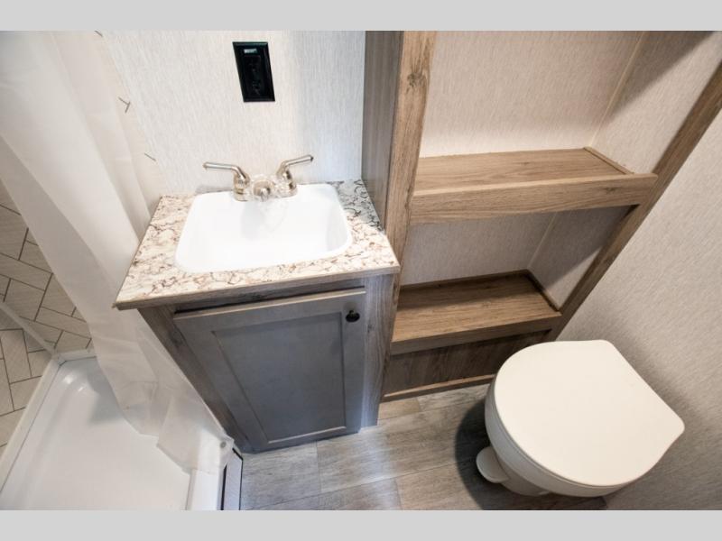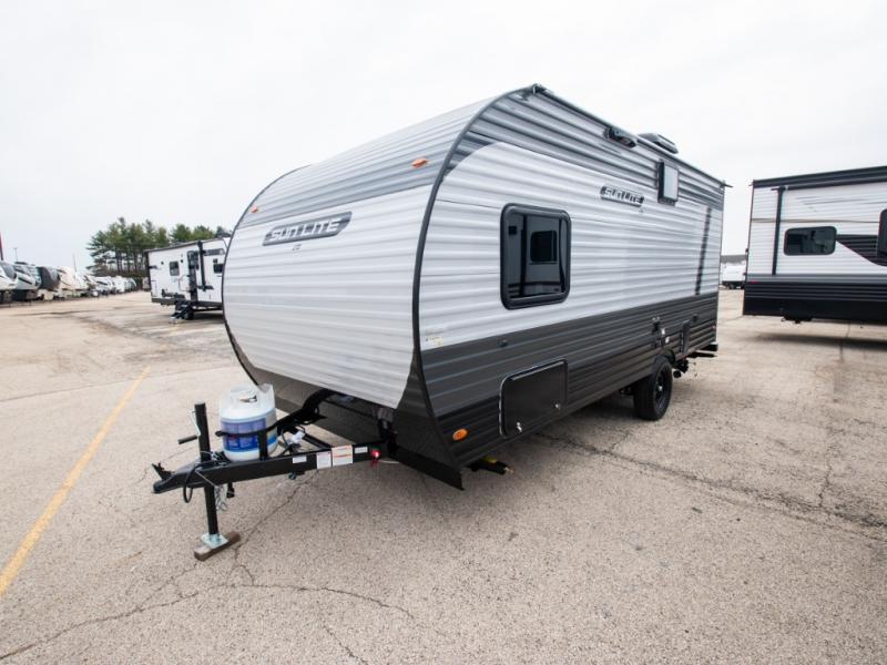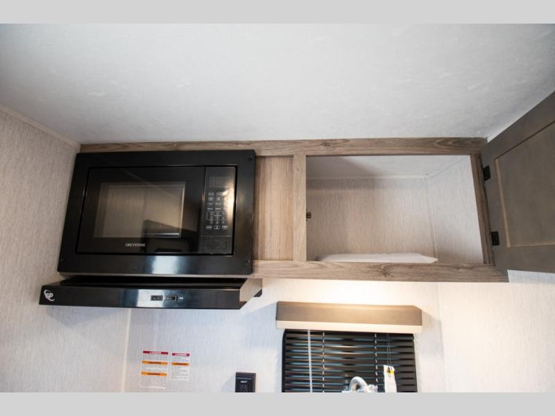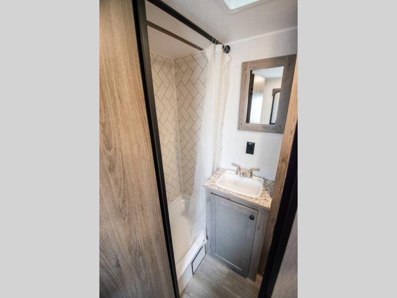 You're going to love every minute spent in this cozy travel trailer for three happy campers! The rear corner kitchen includes a two burner stove and double sink for easy clean up, and the full bath is in the other rear corner. This model also includes a 4.3 cu. ft. 12V refrigerator and a bar top where you can enjoy your meals together each day. The 68" jiffy sofa provides a place to relax in the evenings, and an overnight guests can make their bed here at night. You will find the RV queen bed to be accommodating, especially with its shelf for your personal belongings and a closet for clothes!