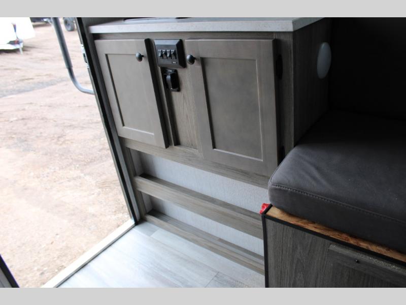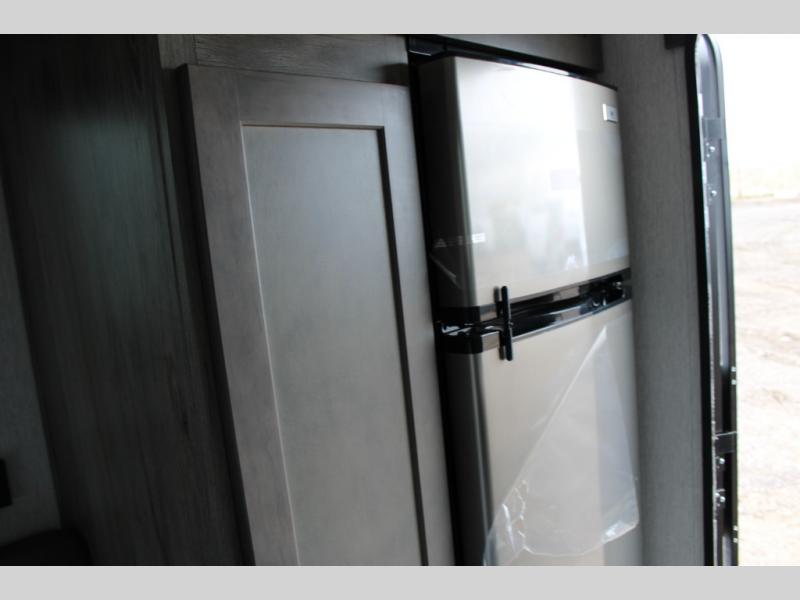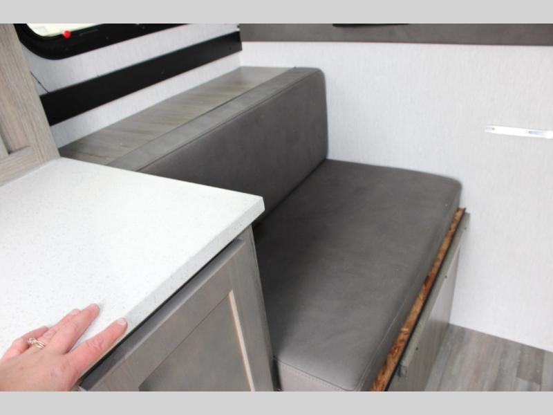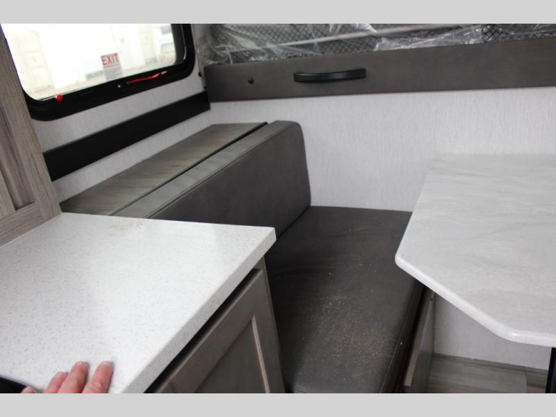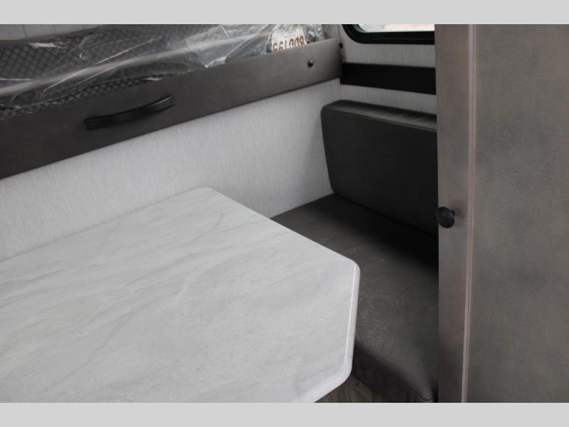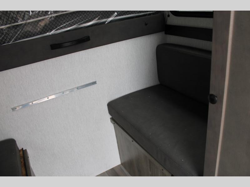 You're sure to find comfort in this truck camper for two! The front bed provides a great night's rest, and there is added seating at the foot of the bed and along the side. This unit also includes counter space, a sink to wash up and a 4.5 12V refrigerator to keep food fresh.