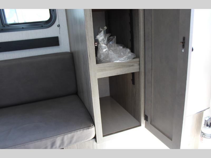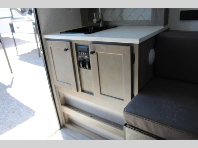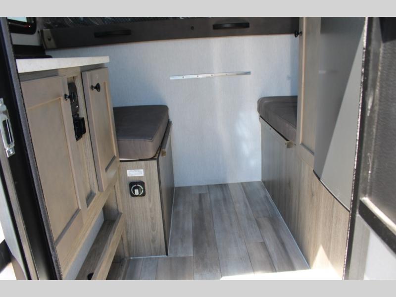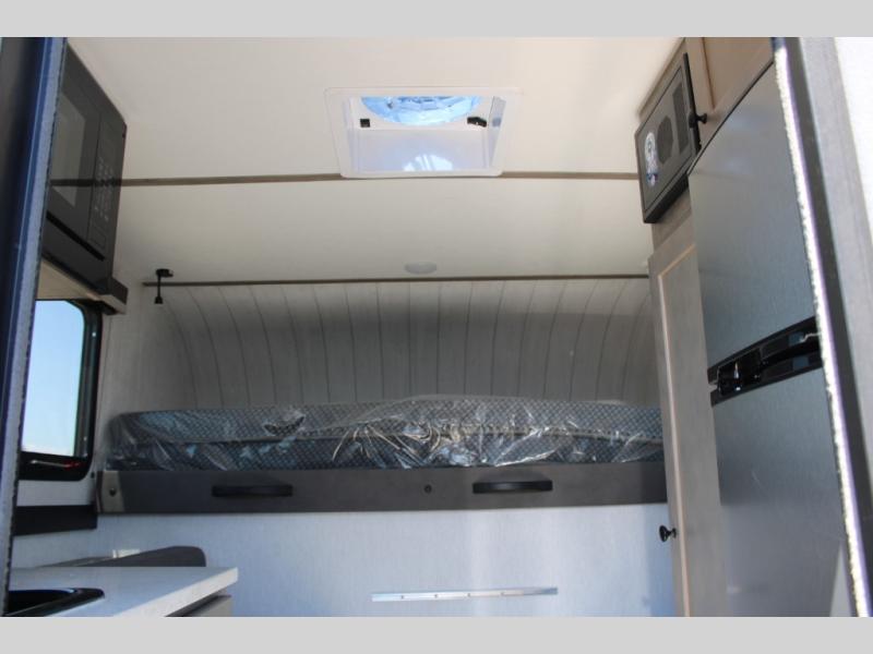 You're sure to find comfort in this truck camper for two! The front bed provides a great night's rest, and there is added seating at the foot of the bed and along the side. This unit also includes counter space, a sink to wash up and a 4.5 12V refrigerator to keep food fresh.