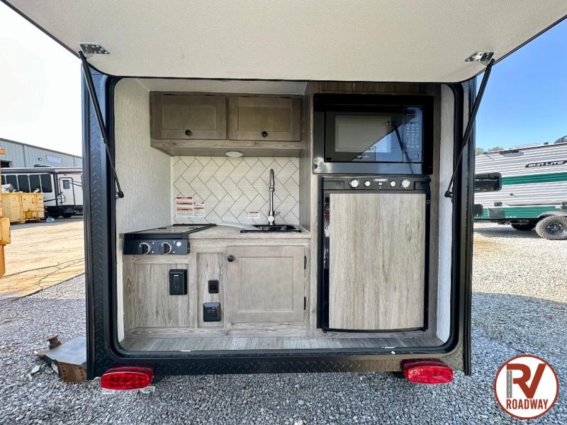 This Sunray travel trailer with its 12' length and 1,320-LB dry weight, is simple to navigate. You have most of the basic essentials without needing to tow all of the extra weight. There is an outdoor kitchen that comes with a two-burner stove top, a refrigerator, and a microwave so that you can cook dinner without having to start a fire. You will have an outside shower that you can use for various purposes, like rinsing off your equipment, filling a bucket with water, or hosing down your muddy puppy, and there are USB ports and a Winegard HDTV antenna to keep you modern.