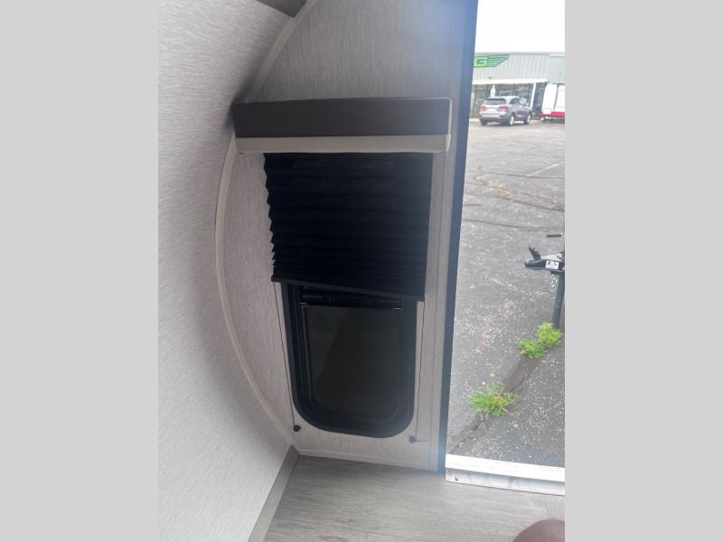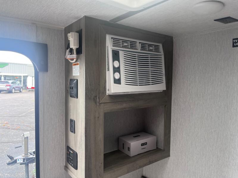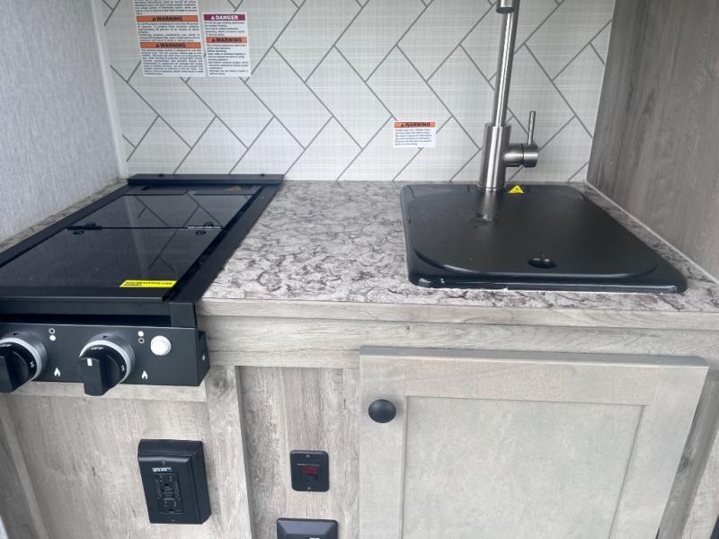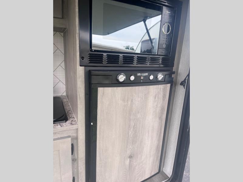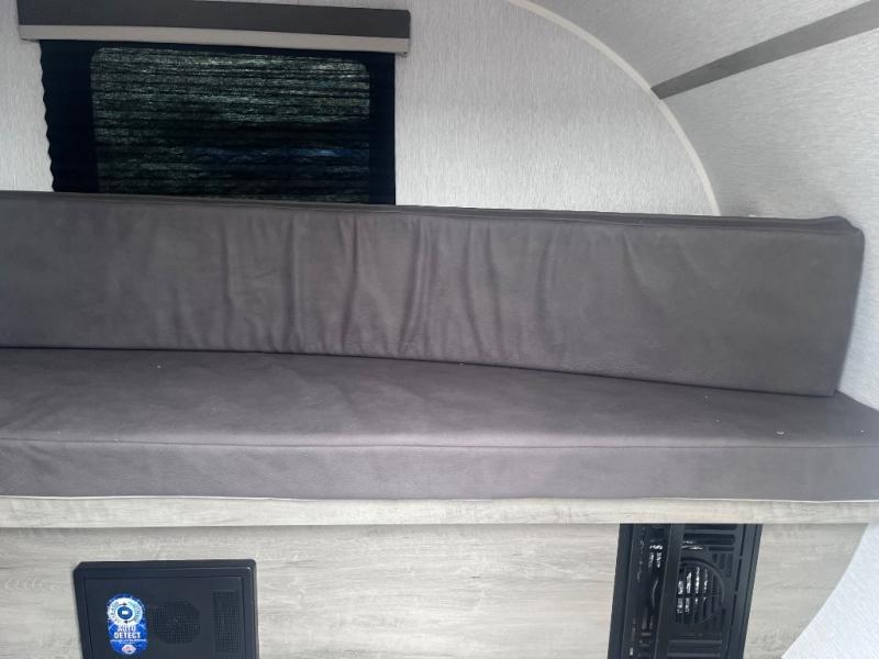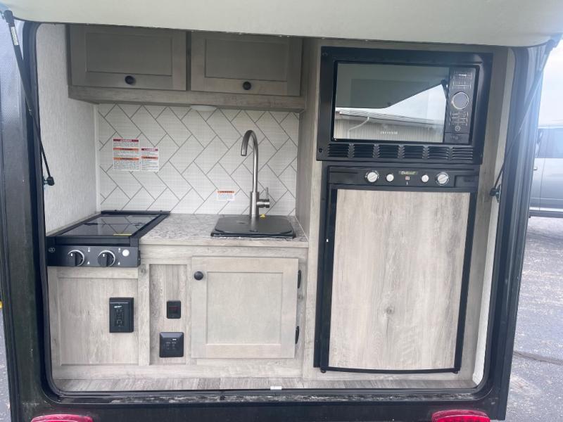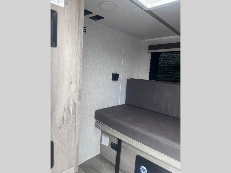 This Sunray travel trailer with its 12' length and 1,320-LB dry weight, is simple to navigate. You have most of the basic essentials without needing to tow all of the extra weight. There is an outdoor kitchen that comes with a two-burner stove top, a refrigerator, and a microwave so that you can cook dinner without having to start a fire. You will have an outside shower that you can use for various purposes, like rinsing off your equipment, filling a bucket with water, or hosing down your muddy puppy, and there are USB ports and a Winegard HDTV antenna to keep you modern.
