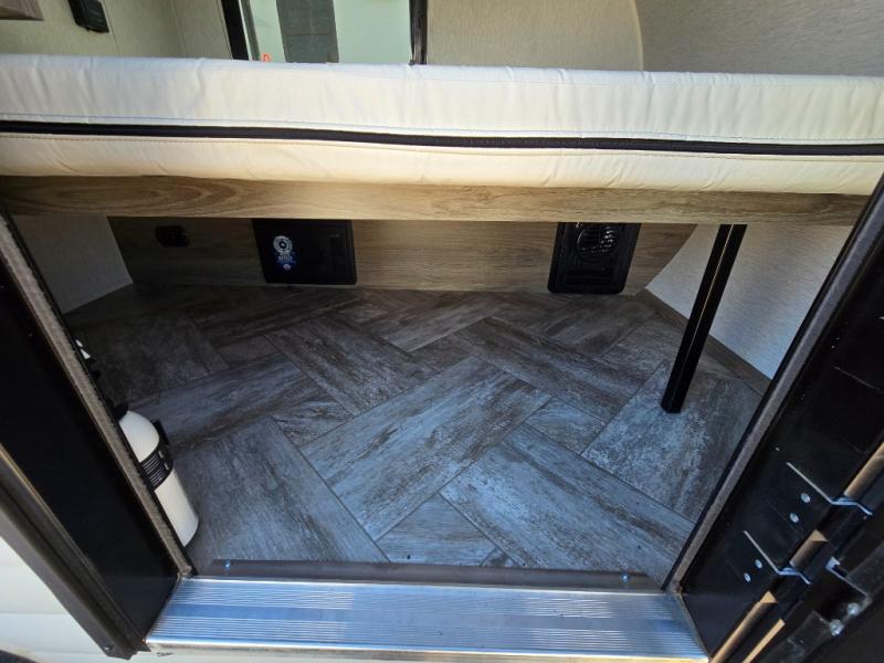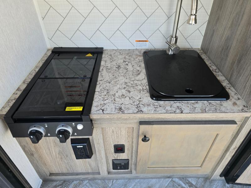 This Sunray travel trailer is set up just like its original counterpart, model 109, but this model comes with an extra advantage: a front ATV rack! You can use this rack to transport your ATVs without having to tow an additional trailer. There is an outdoor kitchen that comes with a two-burner stove top, a refrigerator, and a microwave so that you can cook dinner without having to start a fire. You will have an outside shower that you can use for various purposes, like rinsing off your equipment, filling a bucket with water, or hosing down your muddy puppy, and there are USB ports and a Wineguard HDTV antenna to keep you modern.
