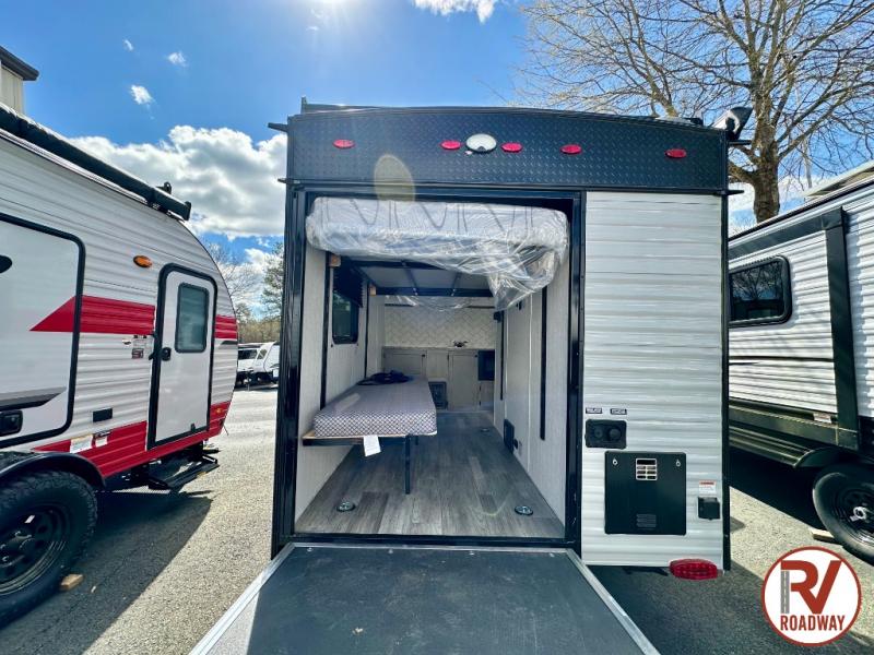 A ramp door makes it easy to load and unload this Sunray travel trailer! Since there is a folding bed, you won't have to blow up an air mattress to sleep at night. Make your world-famous pancakes on the outside two-burner stove top, and spend some time washing dishes afterwards in the indoor and outdoor sinks. Also on the interior, you will find a private toilet which will be ultra convenient when you wake up in the middle of the night and need to go to the bathroom. The tinted safety glass windows come with night shades to give you privacy at night and sunlight during the day. You could even add an optional fireplace for a truly relaxing evening indoors!