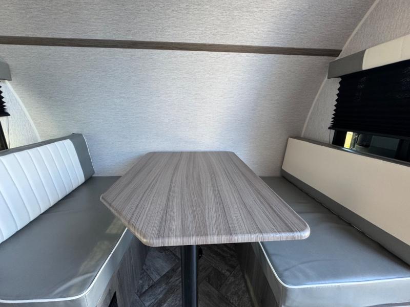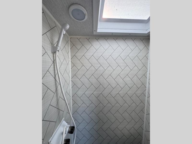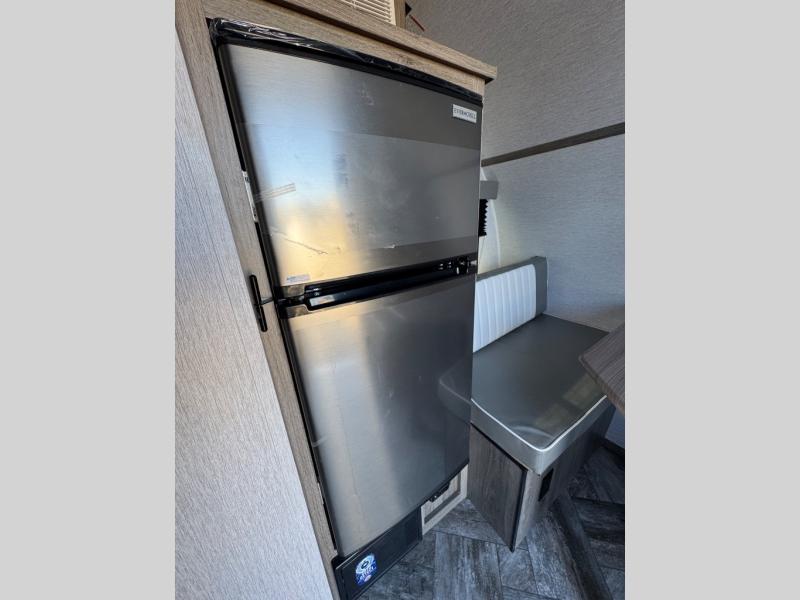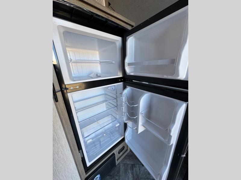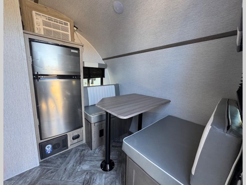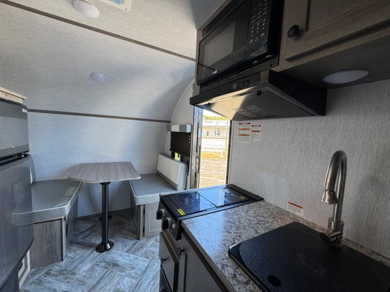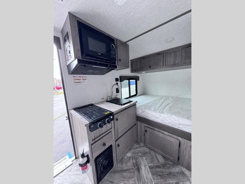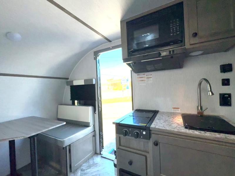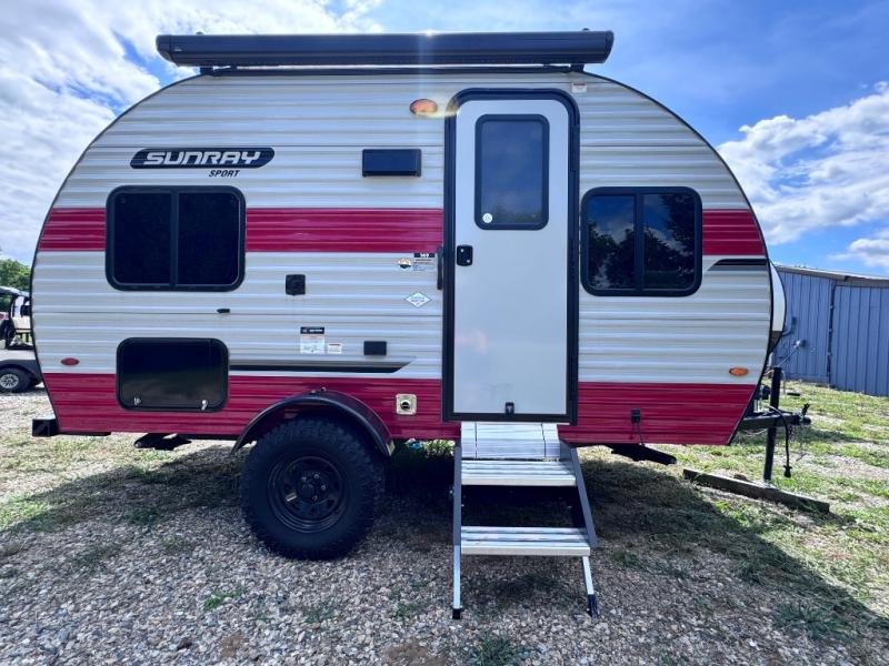 This Sunray travel trailer is the largest and most accommodating because it comes with a wet bath so that you can even take a shower in your trailer! There is a small kitchen on the interior that comes with a two-burner stove top, a refrigerator, and a microwave so that you can cook dinner without having to start a fire, and since it is indoors, you will be able to keep the bugs away while you prepare something delicious to eat. If you need to rinse off some gear, the outside shower will be especially useful, and if you need to charge your devices, use the USB ports. You will also find a Winegard HDTV antenna on this model. Add the available Classic option for 14" tires instead of the off-road version, color matching rims with Moon Caps, and Retro decor and Diner-Style countertops.