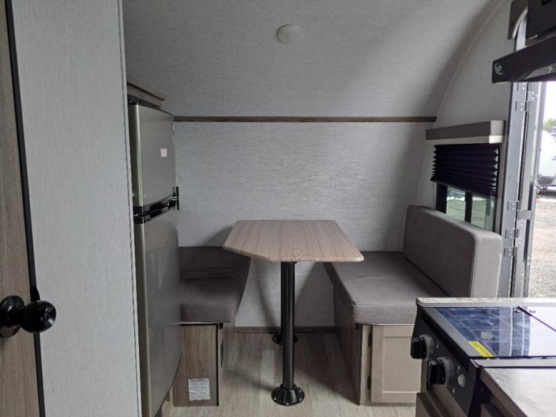 This Sunray travel trailer is the largest and most accommodating because it comes with a wet bath so that you can even take a shower in your trailer! There is a small kitchen on the interior that comes with a two-burner stove top, a refrigerator, and a microwave so that you can cook dinner without having to start a fire, and since it is indoors, you will be able to keep the bugs away while you prepare something delicious to eat. If you need to rinse off some gear, the outside shower will be especially useful, and if you need to charge your devices, use the USB ports. You will also find a Winegard HDTV antenna on this model. Add the available Classic option for 14" tires instead of the off-road version, color matching rims with Moon Caps, and Retro decor and Diner-Style countertops.