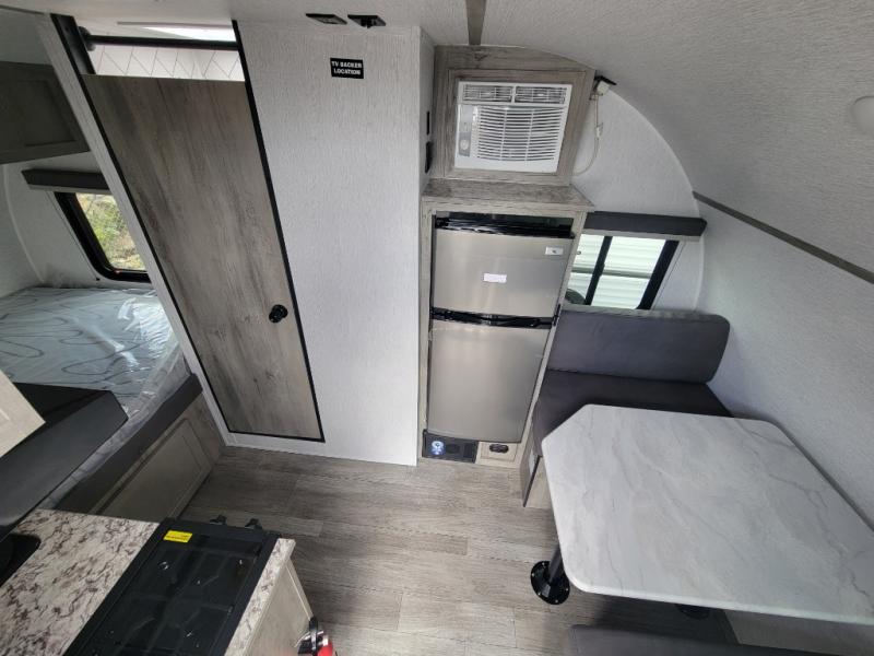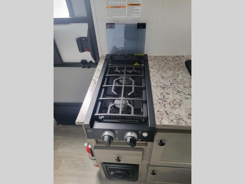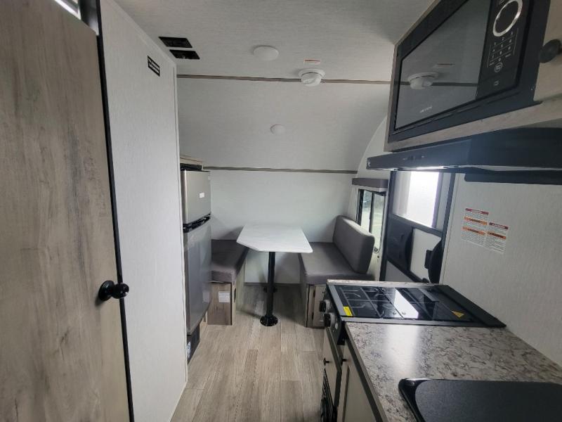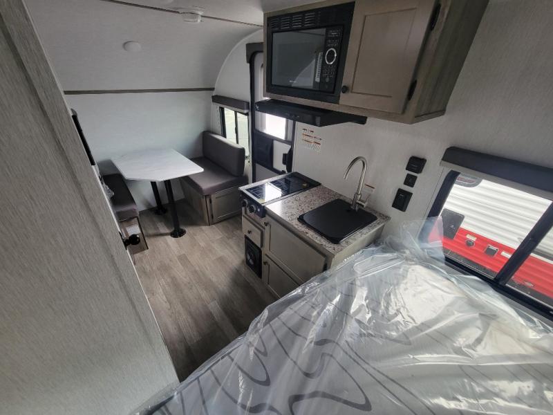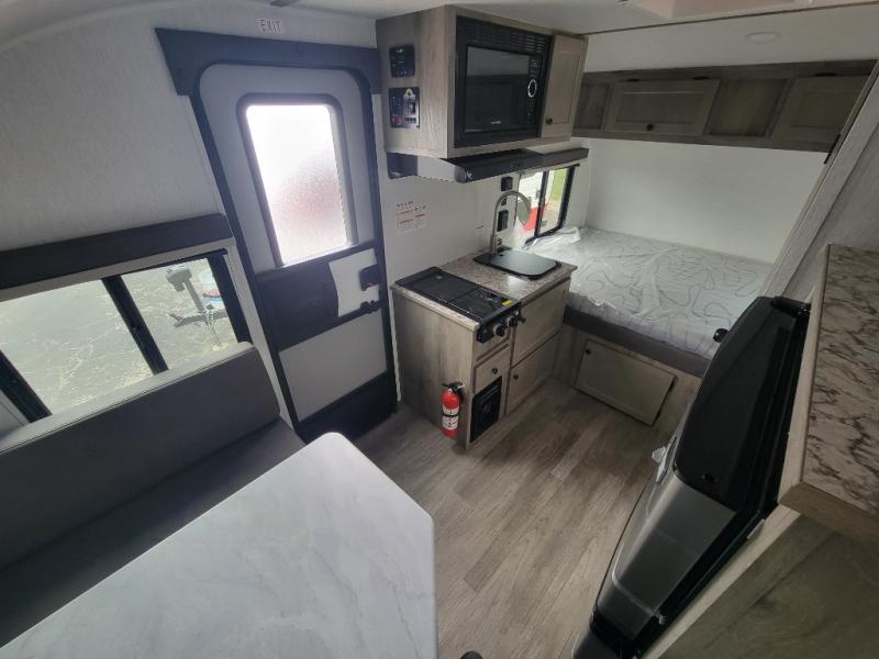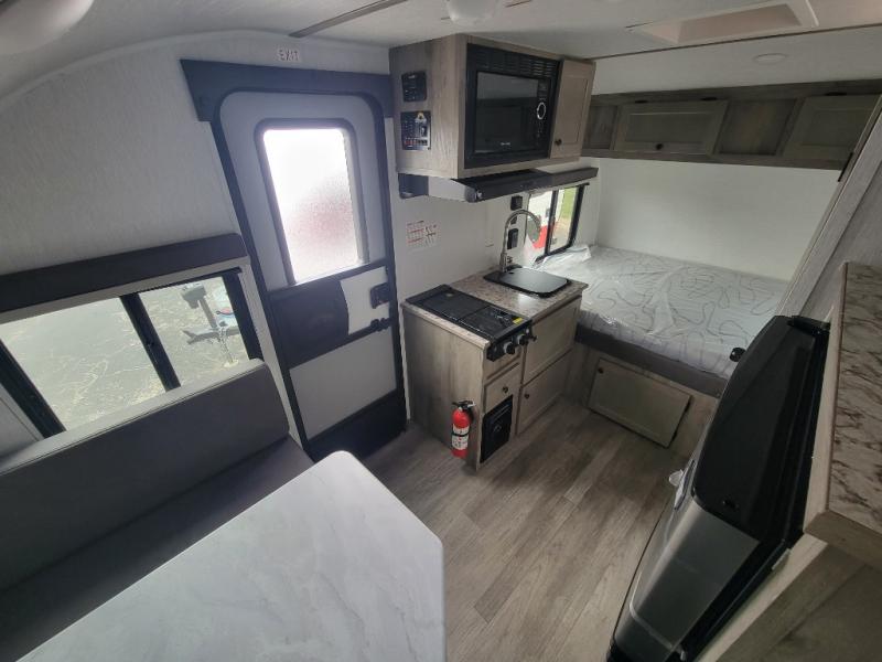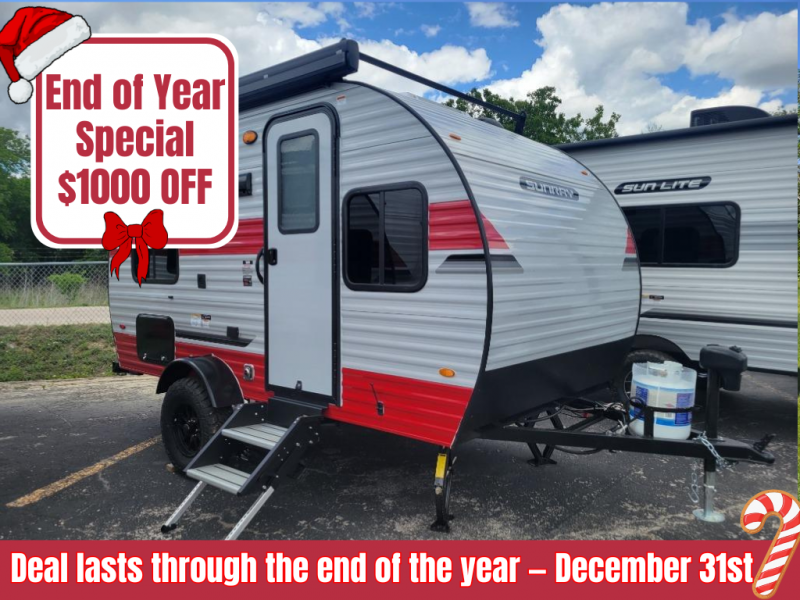 This Sunray travel trailer is the largest and most accommodating because it comes with a wet bath so that you can even take a shower in your trailer! There is a small kitchen on the interior that comes with a two-burner stove top, a refrigerator, and a microwave so that you can cook dinner without having to start a fire, and since it is indoors, you will be able to keep the bugs away while you prepare something delicious to eat. If you need to rinse off some gear, the outside shower will be especially useful, and if you need to charge your devices, use the USB ports. You will also find a Winegard HDTV antenna on this model. Add the available Classic option for 14" tires instead of the off-road version, color matching rims with Moon Caps, and Retro decor and Diner-Style countertops.