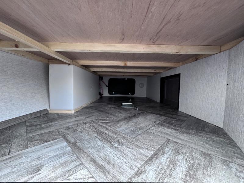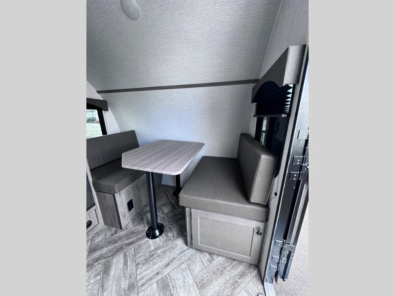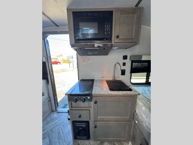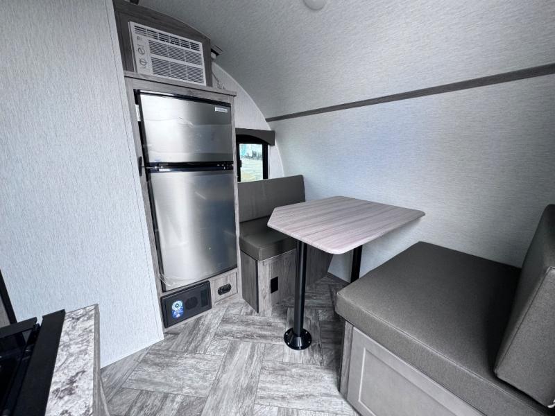 This Sunray travel trailer is the largest and most accommodating because it comes with a wet bath so that you can even take a shower in your trailer! There is a small kitchen on the interior that comes with a two-burner stove top, a refrigerator, and a microwave so that you can cook dinner without having to start a fire, and since it is indoors, you will be able to keep the bugs away while you prepare something delicious to eat. If you need to rinse off some gear, the outside shower will be especially useful, and if you need to charge your devices, use the USB ports. You will also find a Winegard HDTV antenna on this model. Add the available Classic option for 14" tires instead of the off-road version, color matching rims with Moon Caps, and Retro decor and Diner-Style countertops.