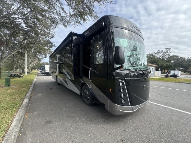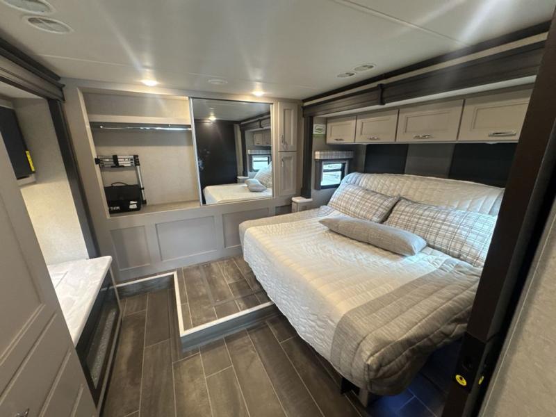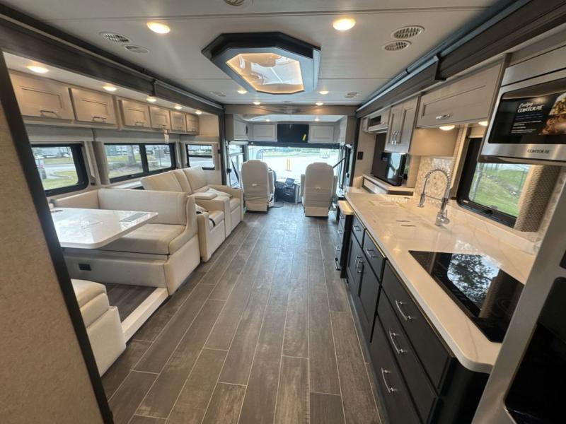 With any Aria Class A diesel motorhome by Thor Motor Coach, experience RV living with all the luxurious amenities you are accustom to, command the roadways with improved handling from the VFS front axle with a 55-degree wheel cut, and enjoy a smooth ride thanks to the Air-Ride suspension and Sachs shock absorbers. The driver will also appreciate the 10.1" touchscreen dash radio with Bluetooth, and Sirius/XM prep when navigating the roads, and the comfort of the leatherette reclining/swivel adjustable captain's chairs. The bathroom provides an oversized full height shower with a glass door and a designer backsplash, while the kitchen provides solid surface countertops and a dinette. You'll also enjoy designer tile backsplash, a large double bowl stainless steel sink with a single handle faucet, a pull-down sprayer, plus full kitchen amenities. More standout features include the Wyndham cabinetry with rake style cabinet doors & nickel finish hardware, plus much much more depending on the Aria you take on the road!