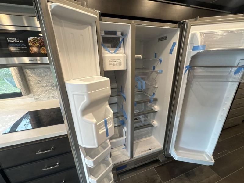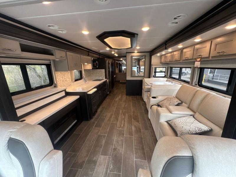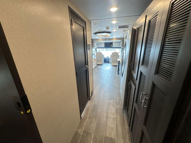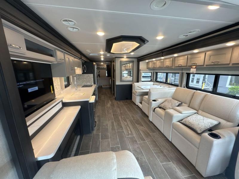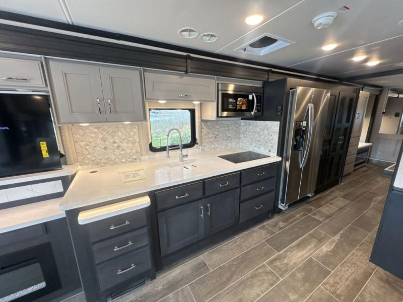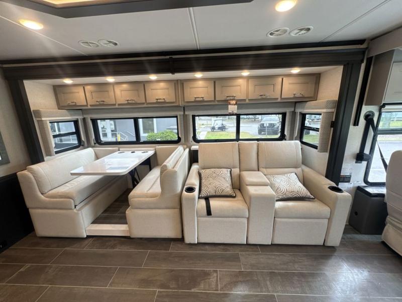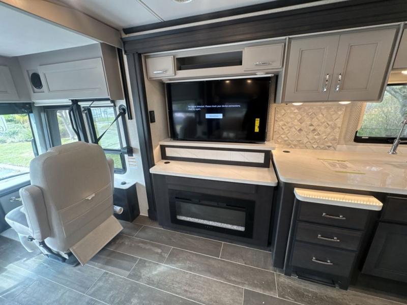 You will love these motorhome characteristics! The rear bedroom is a tranquil sanctuary, boasting an inclining king bed and ample closet space for your finest attire. A lavish TV and a fireplace create a warm ambiance, while a convenient closet with drawers provides meticulous storage. The opulent full bathroom is fully equipped, with everything you need to freshen up. The great kitchen area features a spacious pantry, sleek fridge, microwave, and clever pull-out cabinet for effortless meal preparation. In addition, the expansive 74” dream dinette offers generous space for convivial meals and social gatherings, while the plush 68” reclining theater seating provides ultimate relaxation. In the living room area, a practical pull-out desk provides a dedicated workspace, and a roaring fireplace adds warmth and sophistication. A sleek retractable TV and convenient drop-down overhead bunk offer convenient and flexible entertainment options, plus an overhead TV adds to the lavish features of this motorhome.