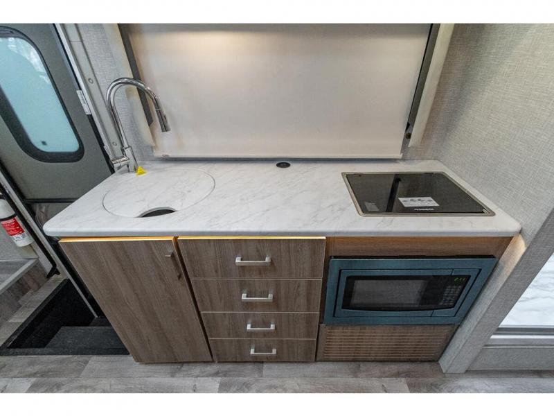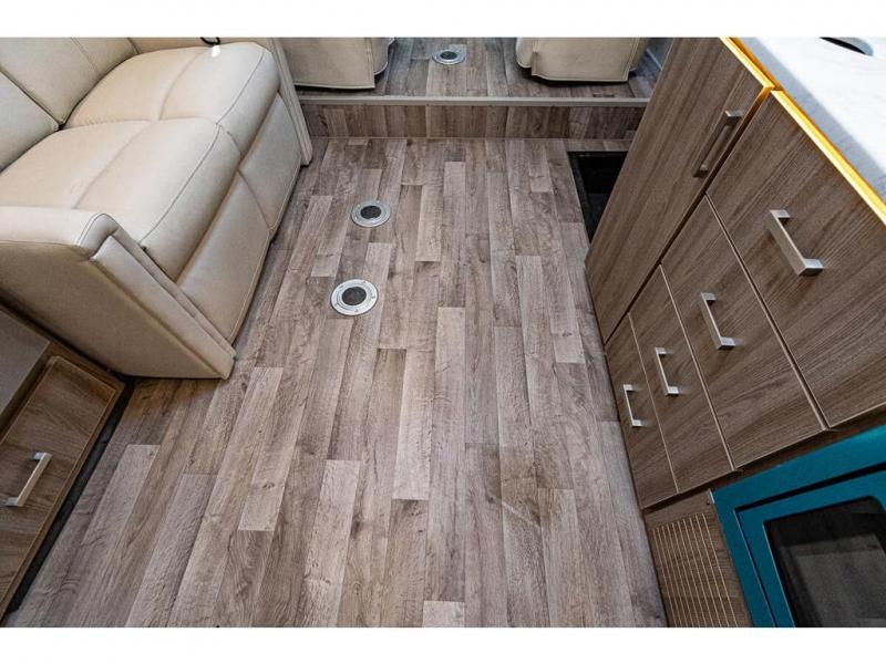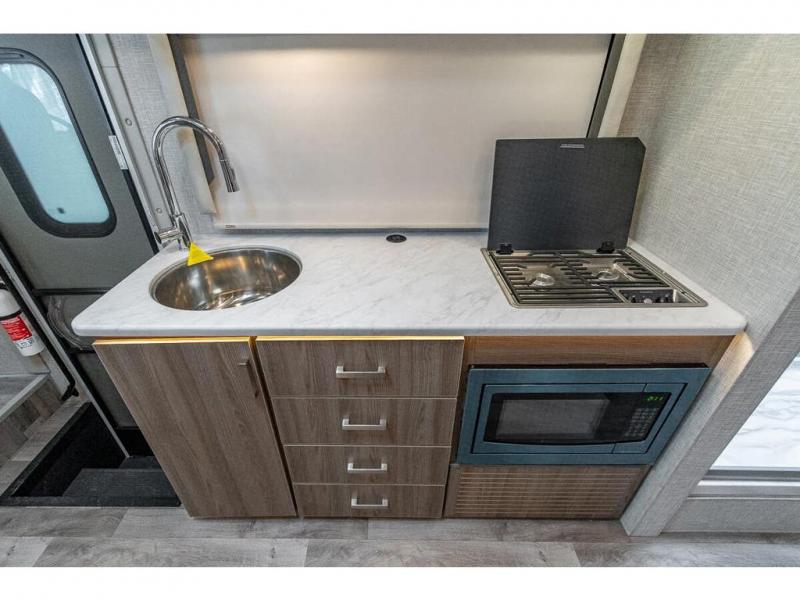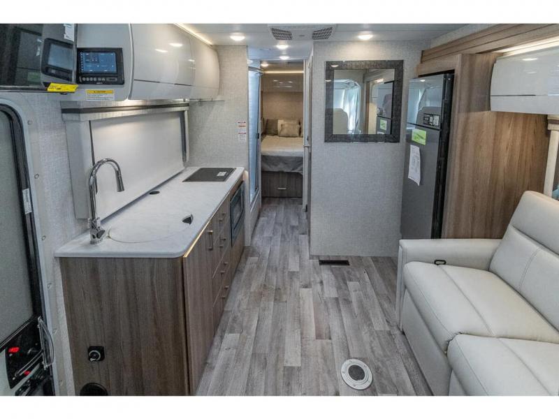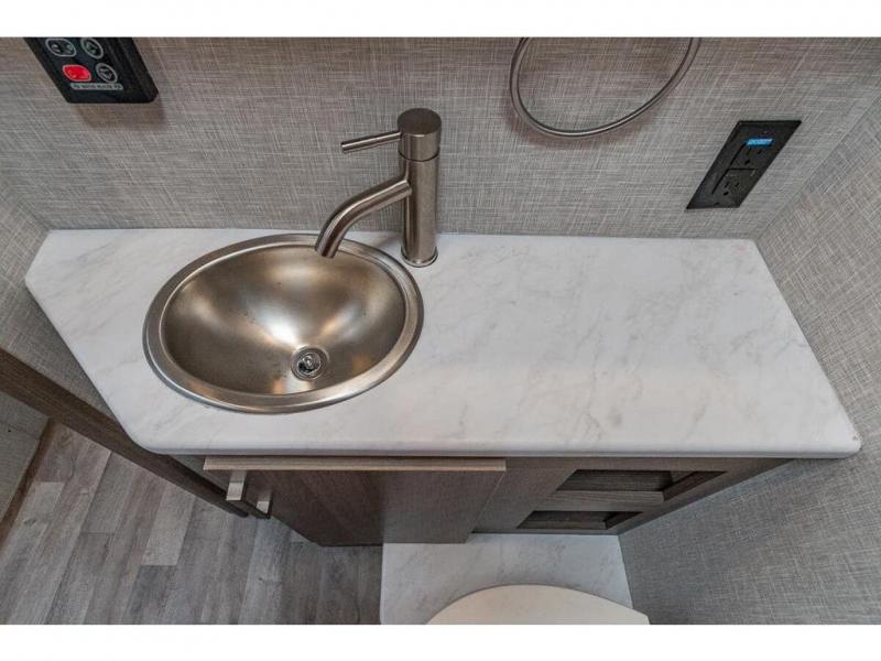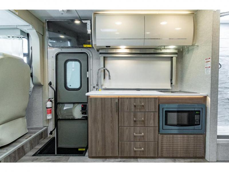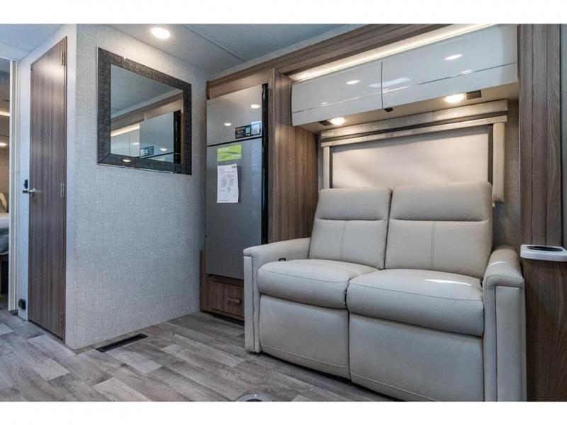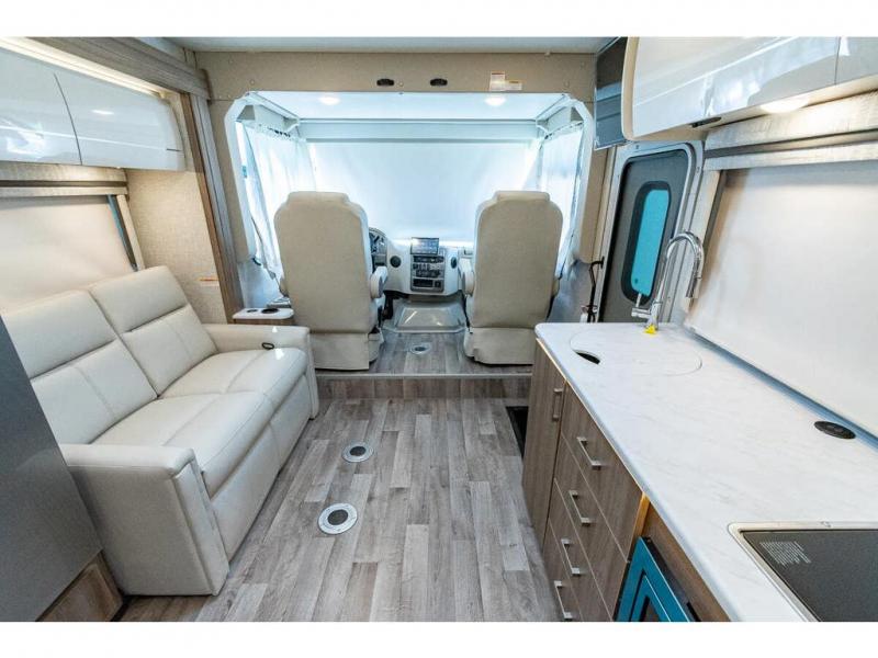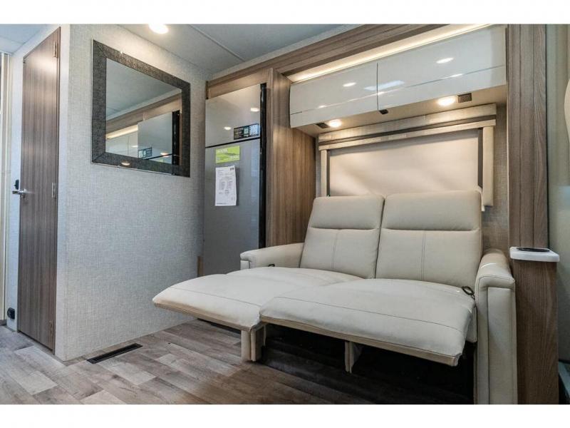 This is a perfect couples coach with room for guests or grandchildren to come along thanks to the drop-down overhead bunk above the cab seats! After you've arrived at your destination and set up camp, prepare lunch with the two burner gas cooktop or in the convection microwave with an air fryer. You'll also find a 12V double door refrigerator for perishables, plus a single bowl sink with a pull-down sprayer and a waste basket for easy clean up. The theater seating slide includes a removable pedestal table in direct view of the 32" Smart TV, and there is a coffee table up front between the swivel captain's chairs for even more seating space. When you're ready for some shut-eye, the rear bedroom with an RV queen bed will provide a great night's rest, and you'll appreciate closets on either side of the bed for your clothes, and even a 32" Smart TV for movie night!