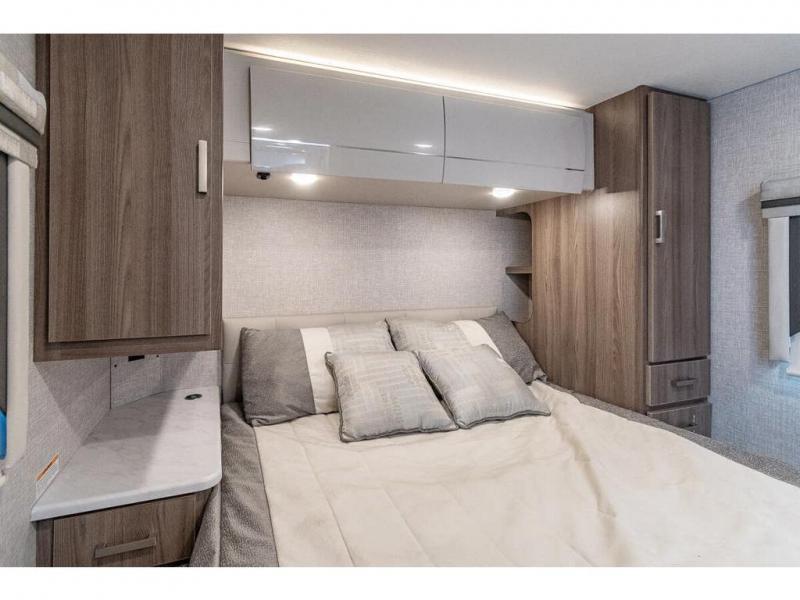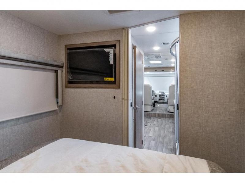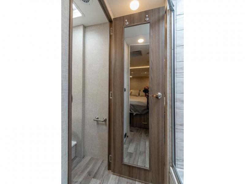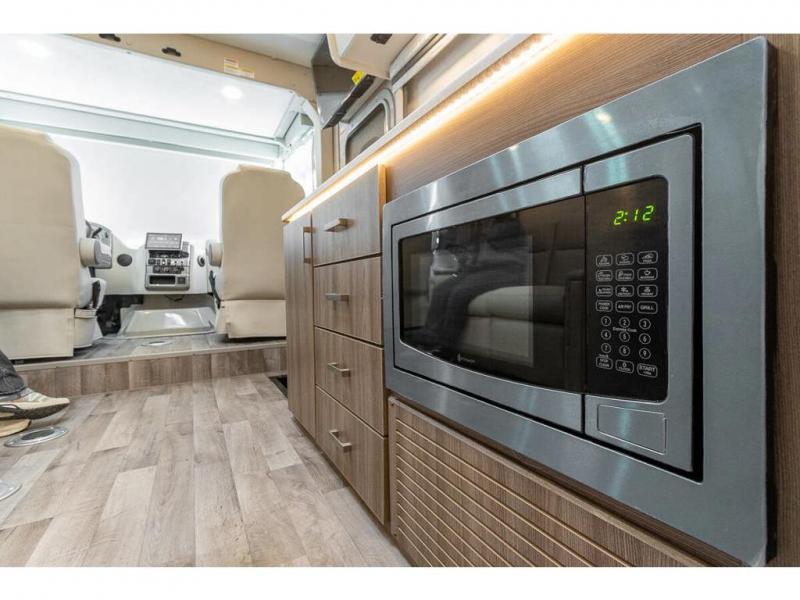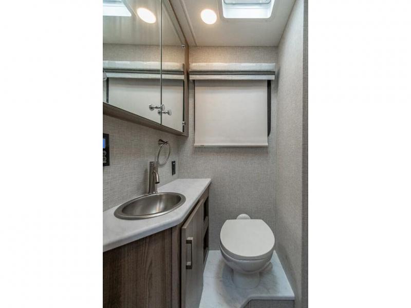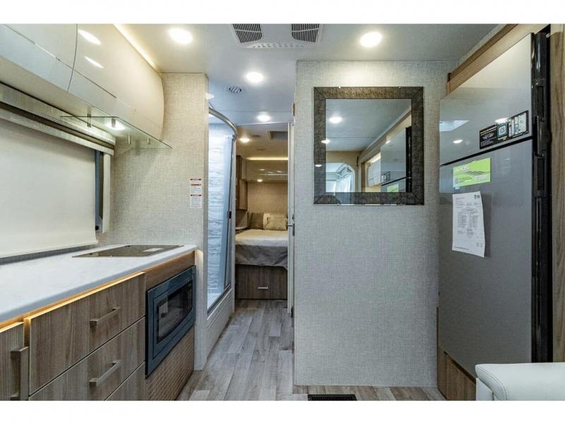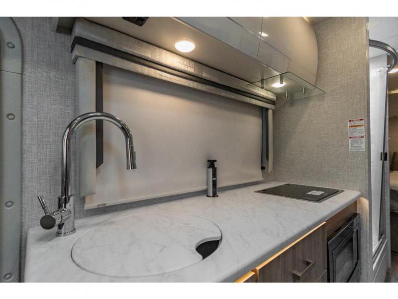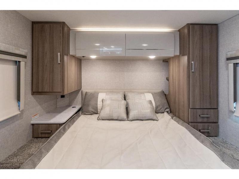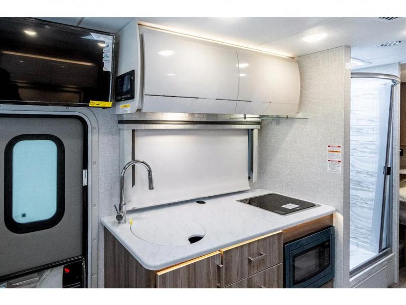 This is a perfect couples coach with room for guests or grandchildren to come along thanks to the drop-down overhead bunk above the cab seats! After you've arrived at your destination and set up camp, prepare lunch with the two burner gas cooktop or in the convection microwave with an air fryer. You'll also find a 12V double door refrigerator for perishables, plus a single bowl sink with a pull-down sprayer and a waste basket for easy clean up. The theater seating slide includes a removable pedestal table in direct view of the 32" Smart TV, and there is a coffee table up front between the swivel captain's chairs for even more seating space. When you're ready for some shut-eye, the rear bedroom with an RV queen bed will provide a great night's rest, and you'll appreciate closets on either side of the bed for your clothes, and even a 32" Smart TV for movie night!