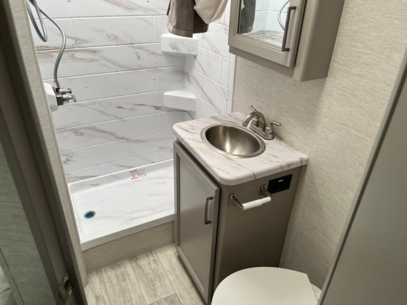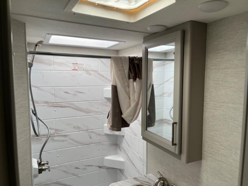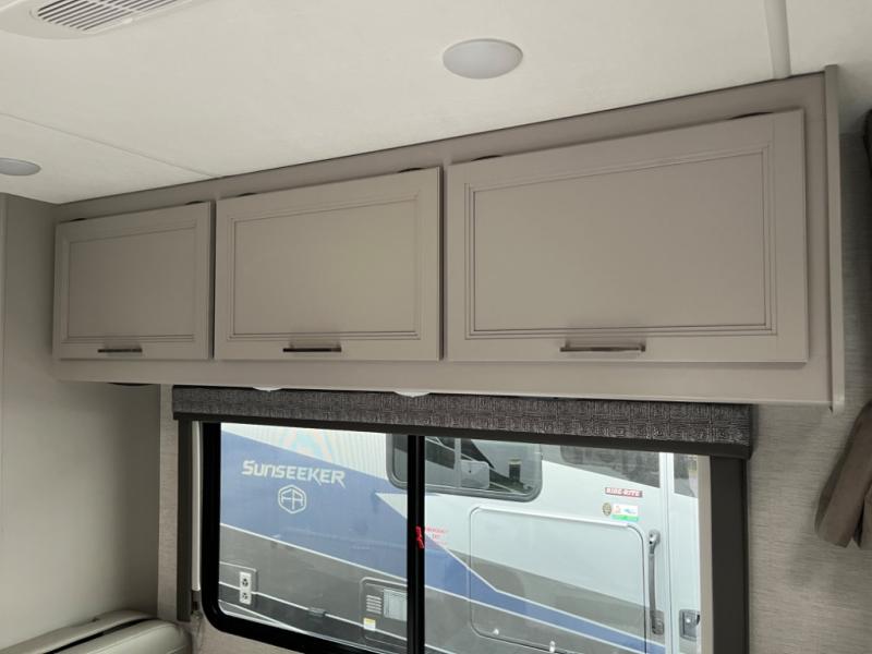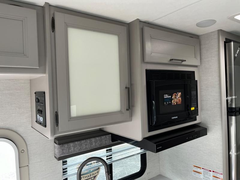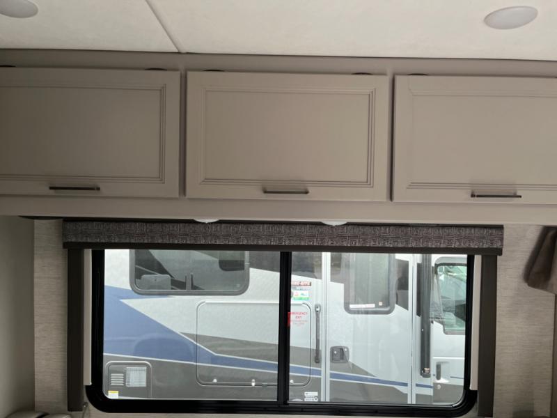 Experience a smooth ride to each destination with the Thor Motor Coach Chateau Class C gas motorhomes! There is a Ford E-Series chassis or optional Chevrolet chassis on select models, and each model includes an 8,000 lb. trailer hitch to bring the family car along. They are constructed with a welded tubular aluminum roof, sidewall cage construction, vacu-bond laminated roof, walls, and floor with block foam insulation to keep the heat and air conditioning inside. The slick fiberglass exterior with graphics package and black framed windows are sure to turn heads down the highway too. Inside, you'll be met with residential vinyl flooring, window privacy shades, a power bath vent, and pressed laminate kitchen countertops. There is even a tankless water heater for endless hot showers, a 4.0 kw gas generator to keep you going, and solar prep for off-grid capabilities!