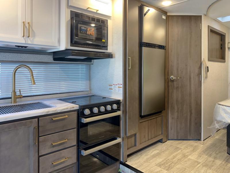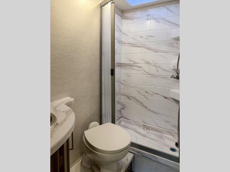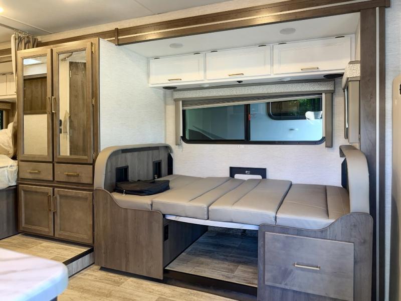 You will feel right at home traveling in this motorhome! After a long day being on the road, you can freshen up in the rear corner bathroom with the 24" x 36" shower that has a skylight above for more head space and natural lighting, plus robe hooks for added convenience. There are two closets to store your items, a pantry for snacks, and a refrigerator for your perishables. The 76" Dream Dinette is not only great for enjoying meals and playing card games, but also for transforming into an extra sleeping space. Speaking of sleeping, you also have a 60" x 74" queen bed slide to lay your head on and a 52" x 96" bunk over cab!