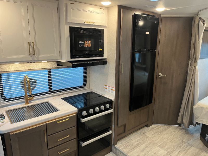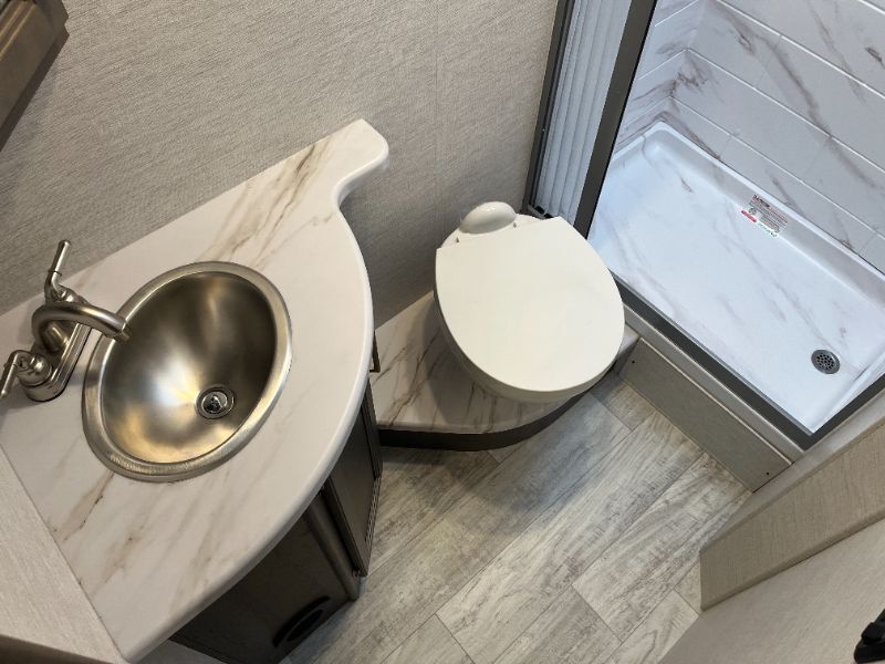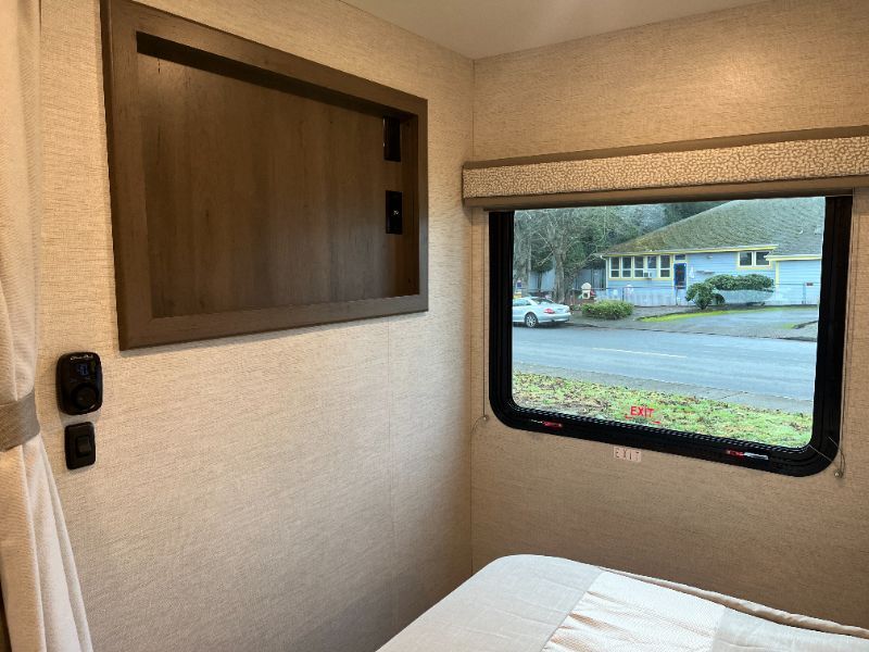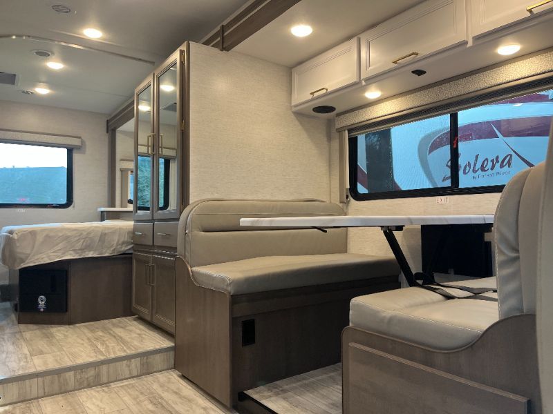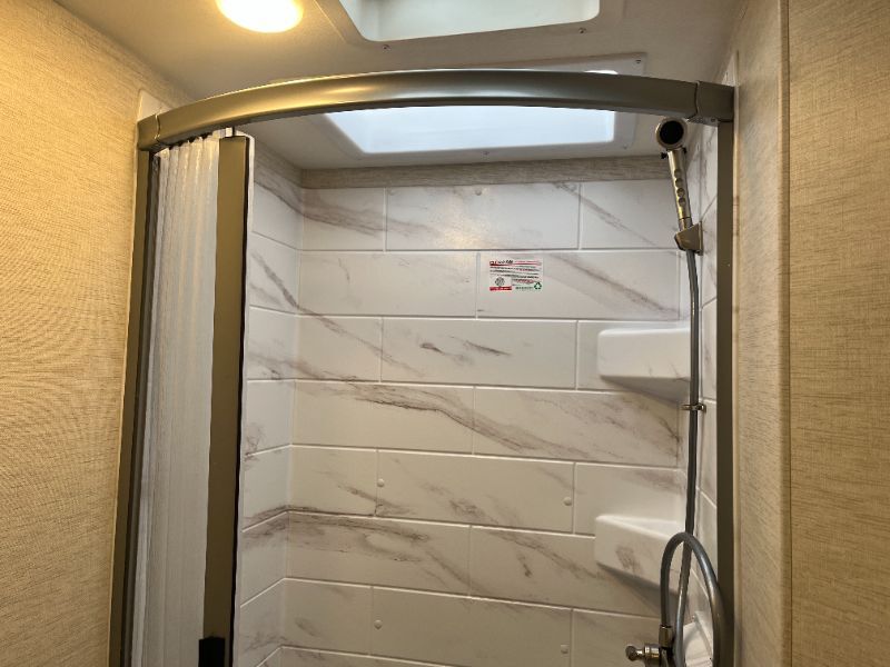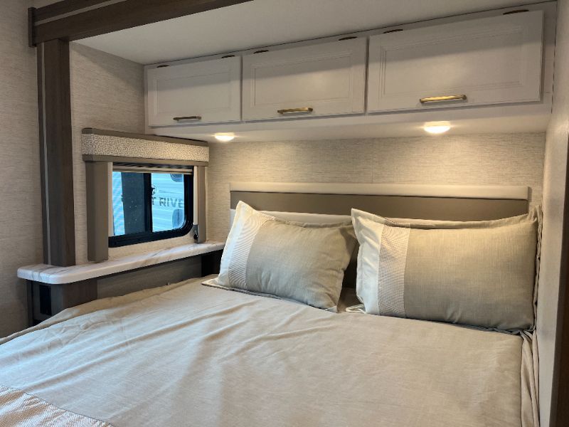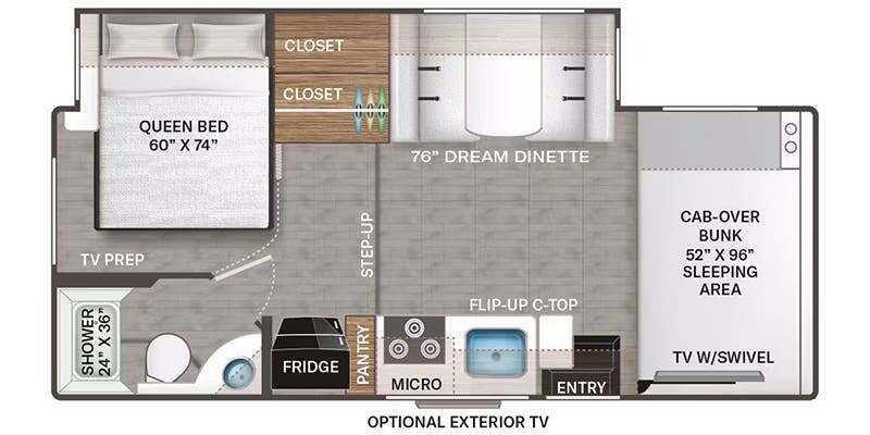 You will feel right at home traveling in this motorhome! After a long day being on the road, you can freshen up in the rear corner bathroom with the 24" x 36" shower that has a skylight above for more head space and natural lighting, plus robe hooks for added convenience. There are two closets to store your items, a pantry for snacks, and a refrigerator for your perishables. The 76" Dream Dinette is not only great for enjoying meals and playing card games, but also for transforming into an extra sleeping space. Speaking of sleeping, you also have a 60" x 74" queen bed slide to lay your head on and a 52" x 96" bunk over cab!
