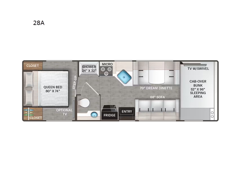 Step up your traveling game with this motorhome! No need to stay at a hotel or eat fast food when you have a rear private bedroom with a 60" x 74" queen bed to lay your head on at night and a three burner cooktop to prepare delicious home cooked meals. The separated bathroom makes it easy for one person to clean up in the 24" x 32" shower while another uses the private toilet and sink. Enjoy meals, play games, and even transform the 70" Dream Dinette into an extra sleeping space. You have even more sleeping space on the 52" x 96" bunk over cab with a 40" TV on a swivel to watch a movie while relaxing on the 68" sofa!