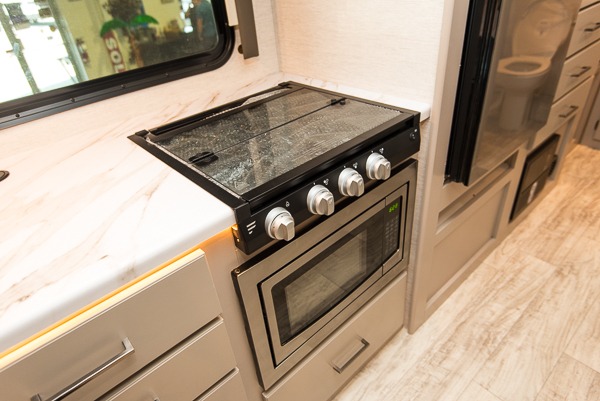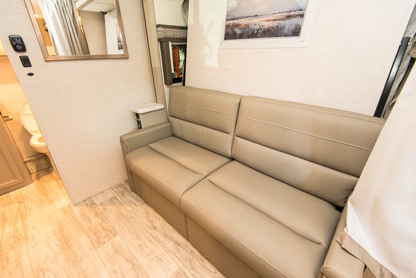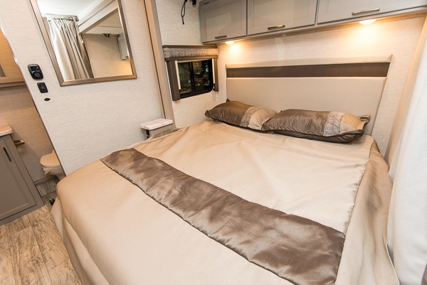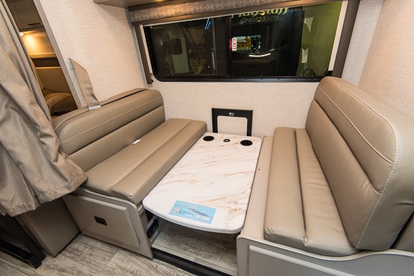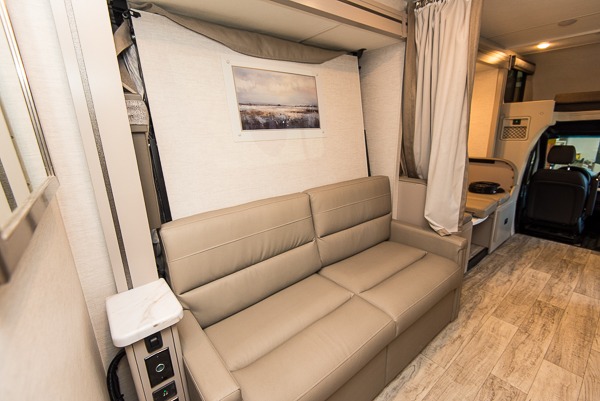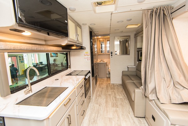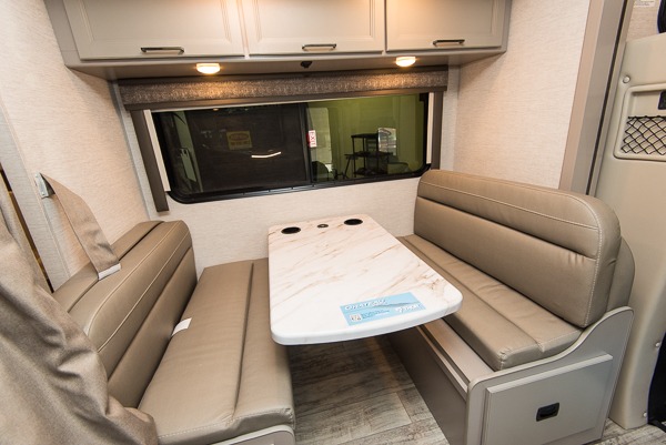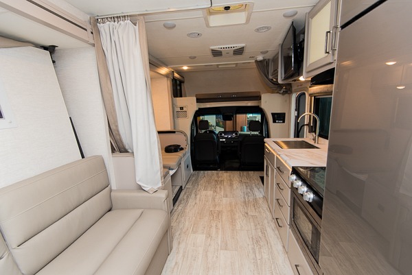 Travel comfortably in this Chateau Sprinter Class C motorhome with a thoughtful layout including a Murphy bed for comfort at night and added floor space during the day. When you close up the Murphy bed you will have a sofa in its place. A 71" Dream Dinette allows for added seating during mealtime and for game playing, and it also can transform into sleeping space at night. Plus, you will have a 52" x 87" cab-over bunk that sleeps two adults or children as well. All will enjoy the full rear bath with a space saving sliding door for privacy. Inside, there is a 24" x 36" shower plus a nice size closet for your clothing. A skylight over the shower adds additional headroom and natural lighting. A full kitchen including a three burner cook-top and microwave oven, plus ample counter space for food prep and a single bowl sink make it easy to provide meals while you travel.