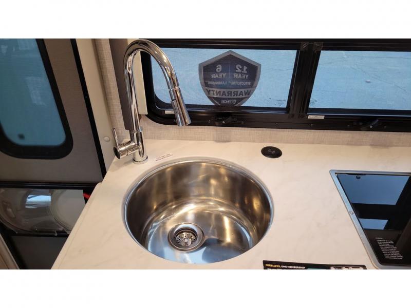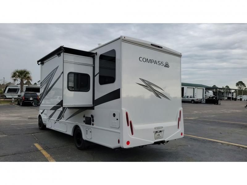 The Thor Motor Coach Compass AWD Class B+ gas motorhome is small but mighty! It includes all-wheel drive, and it is built upon a Ford Transit chassis, 3.5L V6 Eco Boost turbo gas engine, and Ford ten-speed automatic overdrive transmission. The Ford safety features provide excellent care while driving, and you can stay connected to your Compass AWD with the FordPass Connect. The power patio awning with LED lights can be moved out into position with just one touch on your cell phone thanks to the Rapid Camp+ multiplex control system. You will have a 100W solar panel with controller, a 15,000 BTU air conditioner, a Winegard ConnecT 2.0 Wi-Fi/4G/TV antenna, and a tankless water heater as some of the top electrical and plumbing features.