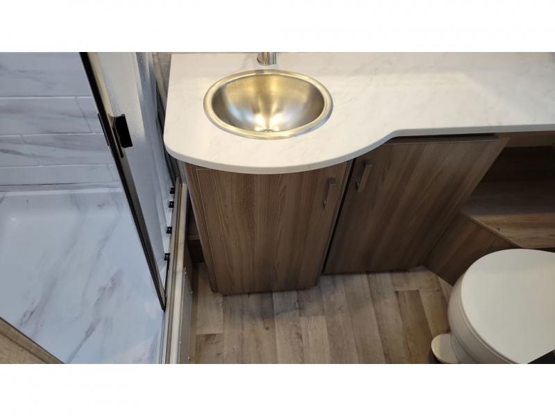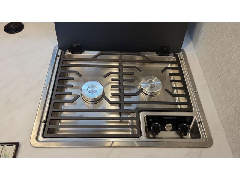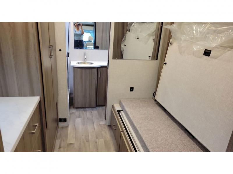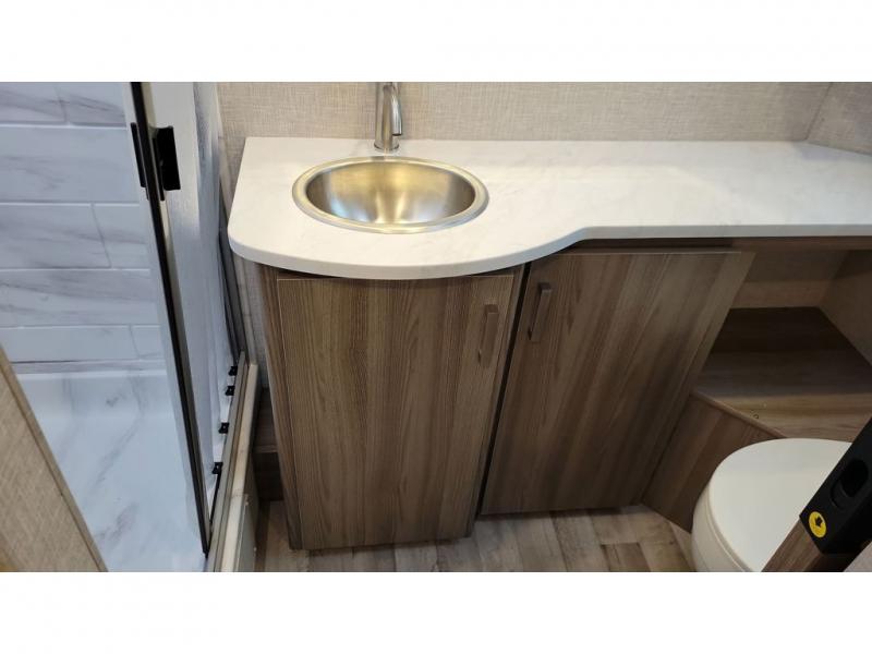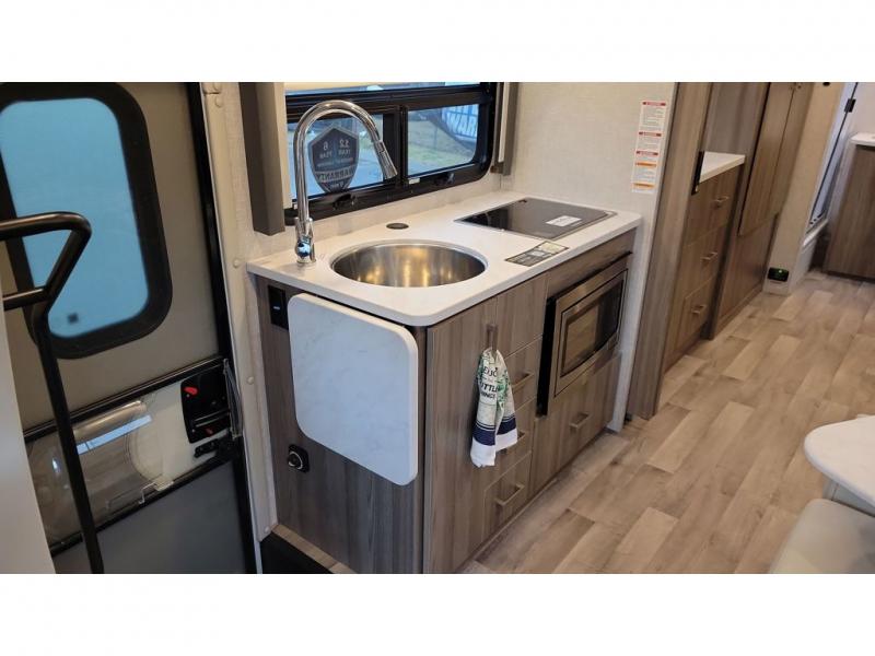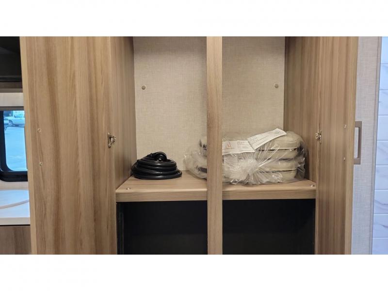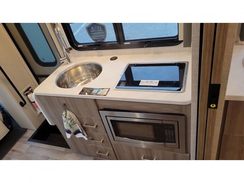 You'll love traveling in this spacious coach that can sleep three happy campers each night. The jack-knife sofa with pull-out ottomans is in perfect view of the living room 32" Smart TV, and the full-equipped kitchen will let you make meals each day without having to get take-out. There is a two burner gas cooktop, a convection microwave with an air fryer, and a 12V dual door refrigerator to keep perishables fresh. The private bedroom includes an easy flip-up RV queen bed with cushioned seating underneath, a retractable TV, and a closet to keep your clothes wrinkle-free. And don't overlook the full rear bath, complete with generous counter space, a shower skylight, robe hooks, and a power bath vent!