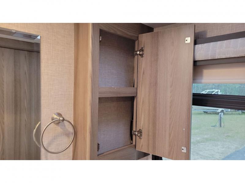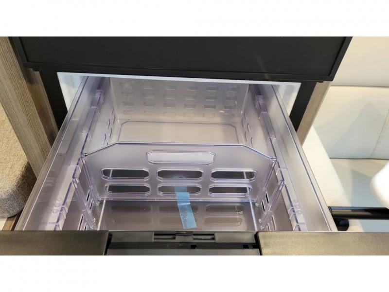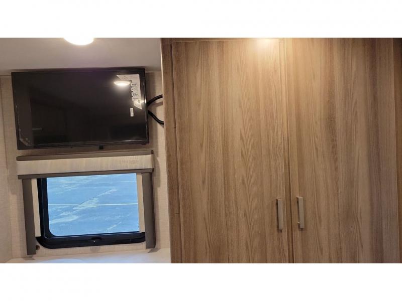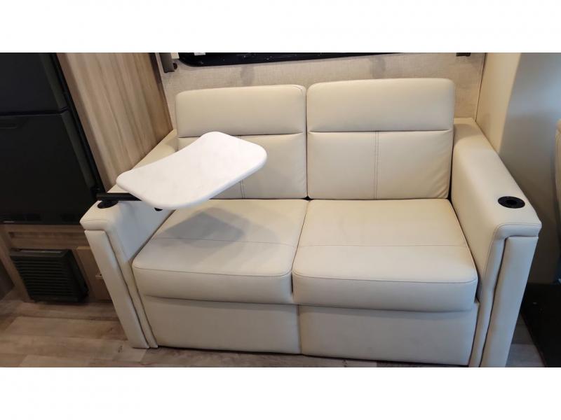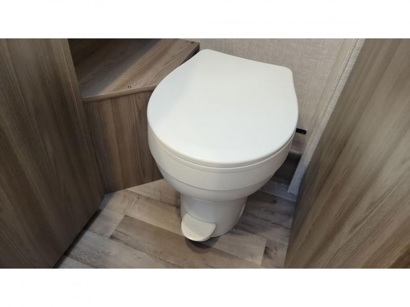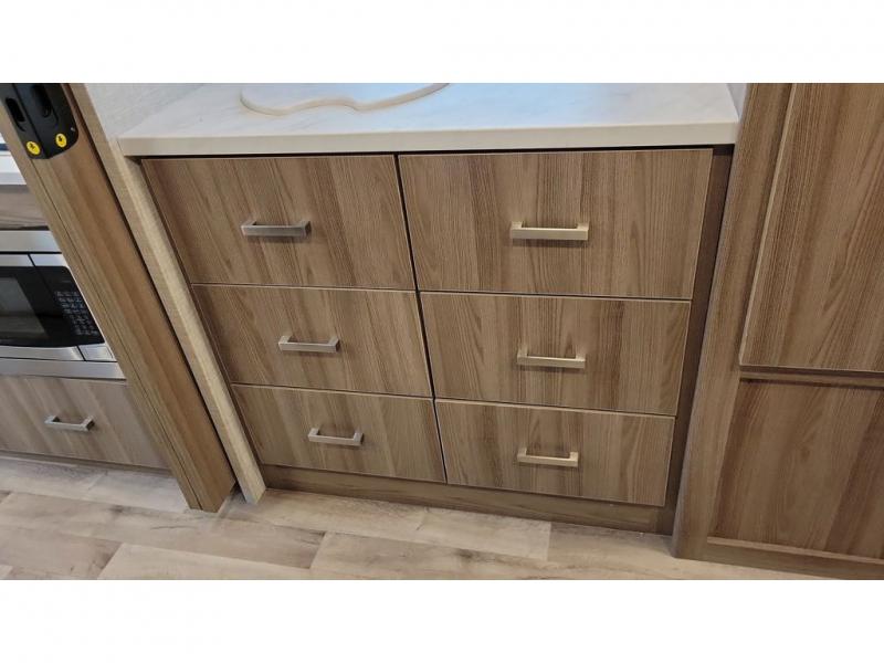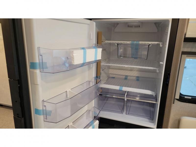 You'll love traveling in this spacious coach that can sleep three happy campers each night. The jack-knife sofa with pull-out ottomans is in perfect view of the living room 32" Smart TV, and the full-equipped kitchen will let you make meals each day without having to get take-out. There is a two burner gas cooktop, a convection microwave with an air fryer, and a 12V dual door refrigerator to keep perishables fresh. The private bedroom includes an easy flip-up RV queen bed with cushioned seating underneath, a retractable TV, and a closet to keep your clothes wrinkle-free. And don't overlook the full rear bath, complete with generous counter space, a shower skylight, robe hooks, and a power bath vent!
