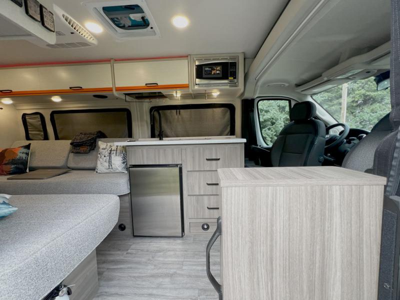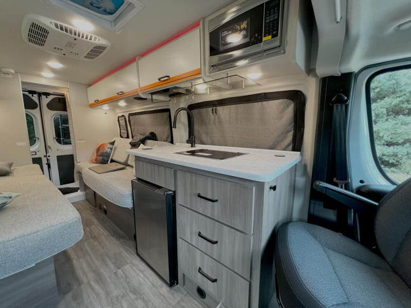 Plenty of amenities are packed into the Thor Motor Coach Dazzle Class B motorhome. Built on the RAM ProMaster® 3500XT gas window van chassis, these come with a 3,500 lb. trailer hitch, an Onan® RV QG 2800 gas generator, and a Truma® Combi Eco LP furnace and water heating system. You'll have a convenient Rapid Camp+® Multiplex wiring control system, which allows you to operate features like lights, generator, slides, awnings, HVAC, and more from an easy to use small handheld remote. Inside, you'll enjoy residential vinyl flooring, a soft-touch vinyl ceiling, and pressed countertops with an undermount sink and sink covers to name a few comforts.