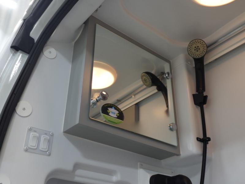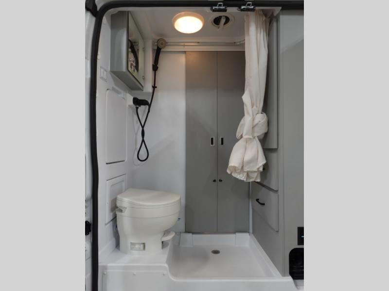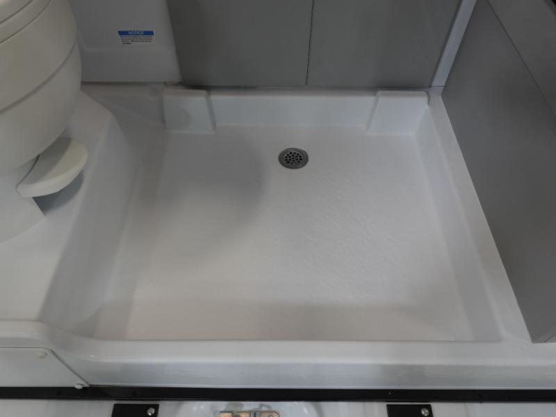 This Thor Motor Coach Dazzle includes a wet bath located all the way to the rear so you have more living space up front. The kitchen is just behind the cockpit swivel chairs, with a single door 12V refrigerator, two burner cooktop, and stainless steel sink. Towards the back are two twin beds that serve as seating areas during the day, and at night they can be converted to a king-size bed. There's also a removable dining table to enjoy all your meals. The fully enclosed rear wet bath features a shower and power vent. There's also an outdoor shower to keep things extra clean.