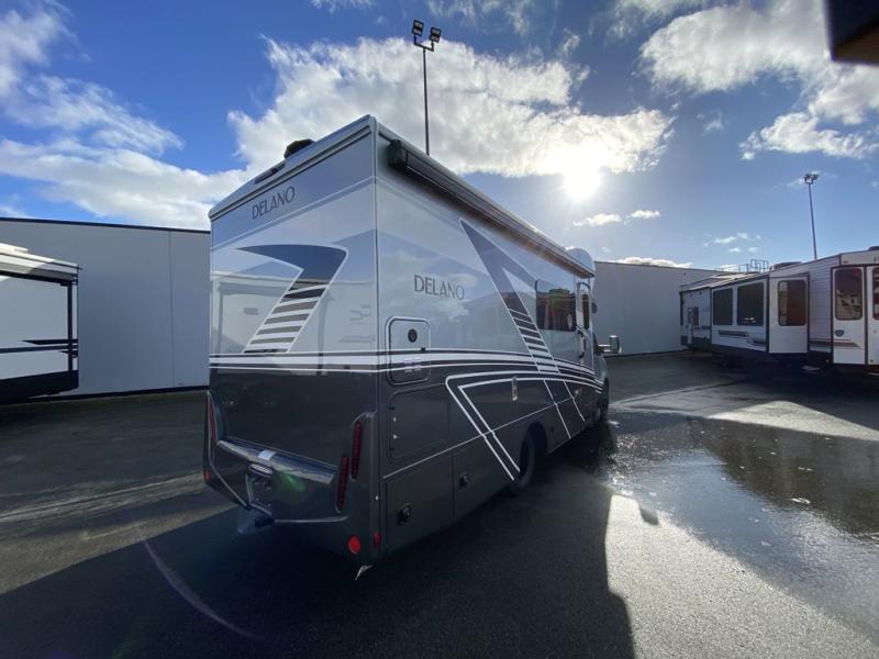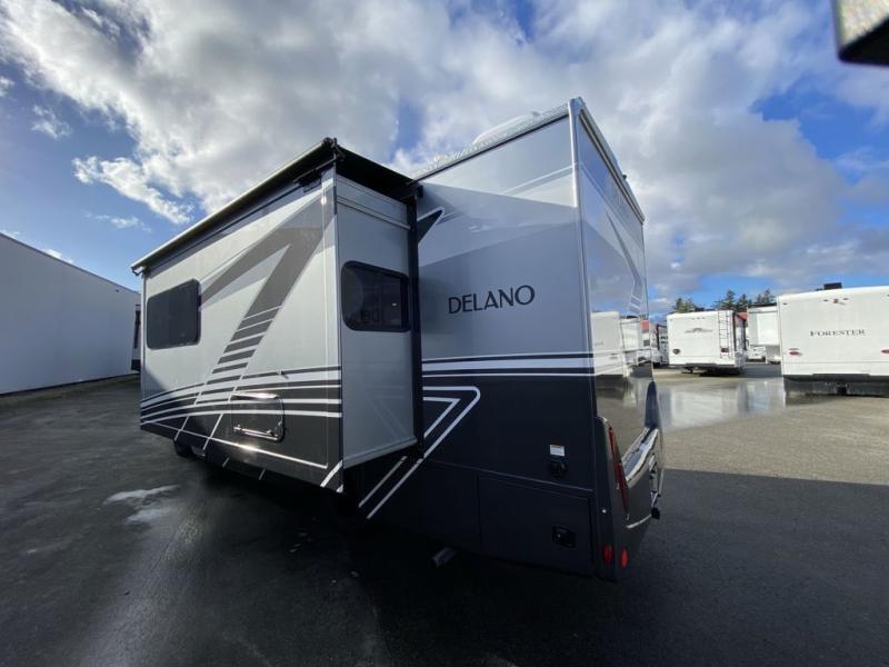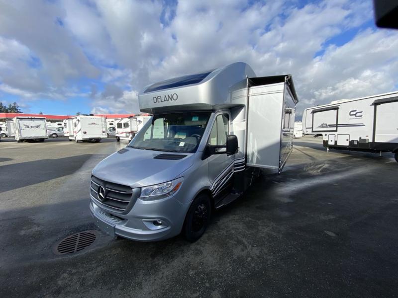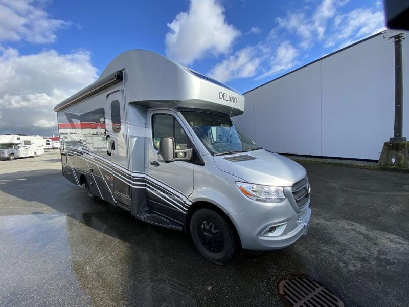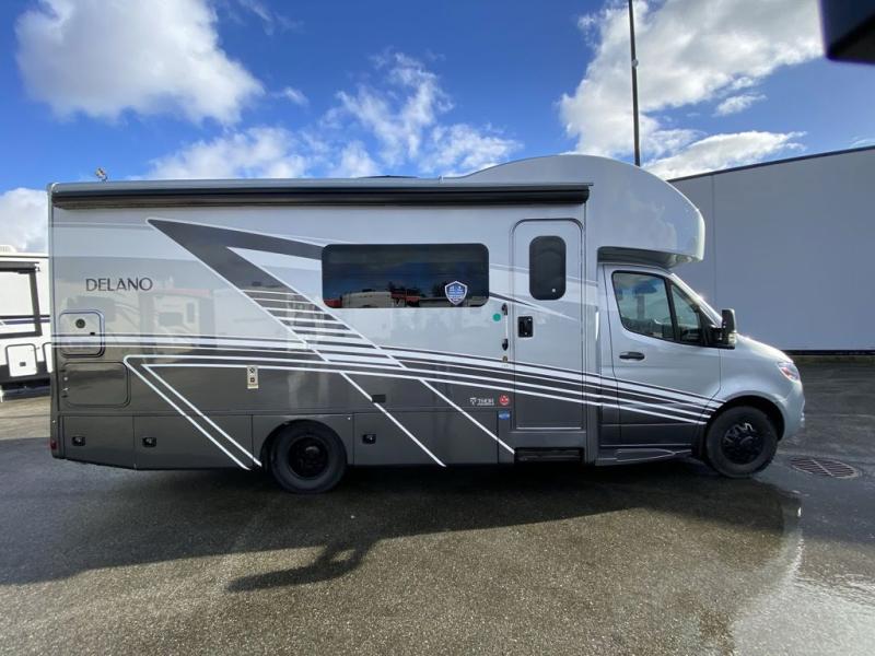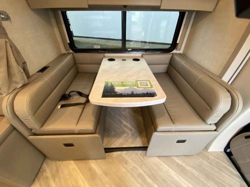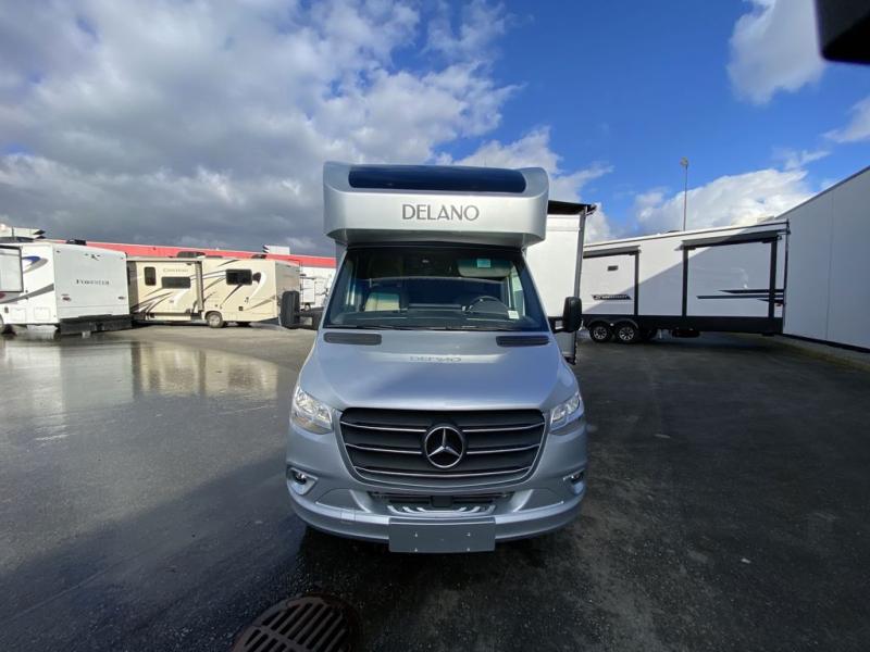 Luxury comes standard in the Delano Sprinter Class C diesel motorhomes by Thor Motor Coach. You will find it so easy to maneuver the road with the Mercedes-Benz Safety package that includes features such as active braking assist and distance regulator distronic plus that will help keep a safe distance from vehicles in front of you, and you can add the optional blind spot detection system for even more convenience. The frameless windows and the full-body paint package with gel coated sidewalls is sure to be eye-catching, plus there is invisible front paint protection for added defense against the elements. Each model includes the Rapid Camp+ multiplex wiring control system that will make set-up easier than ever, a Winegard ConnecT 2.0 WiFi/4G/TV antenna to keep you connected to the outside world, and premium one-piece Crossflex roofing material that is ultra durable. The Delano Sprinter also includes many interior comforts, like the easy-to-clean residential vinyl flooring, the Euro-style cabinetry, and the Leatherette furniture!