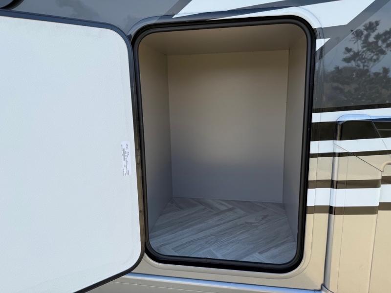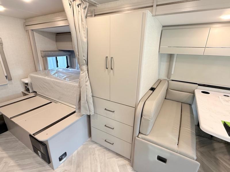 One look at this full-wall slide out coach and you'll be hooked! The swivel captain's seats can become a part of the living area once you're parked, and your guests can sit at the 76" Dream Dinette with storage drawer(s). Prepare lunch on the two burner gas cooktop, or use the convenient convection microwave with an air fryer. You'll find a large closet that can be used for clothes, food, or miscellaneous camp gear, plus there are overhead compartments for even more storage. The cab-over bunk provides additional sleeping space, and you'll enjoy the flip-up queen bed in the bedroom, along with a 32" Smart TV.