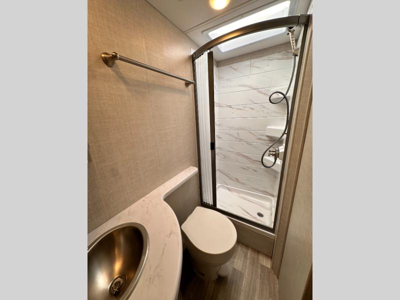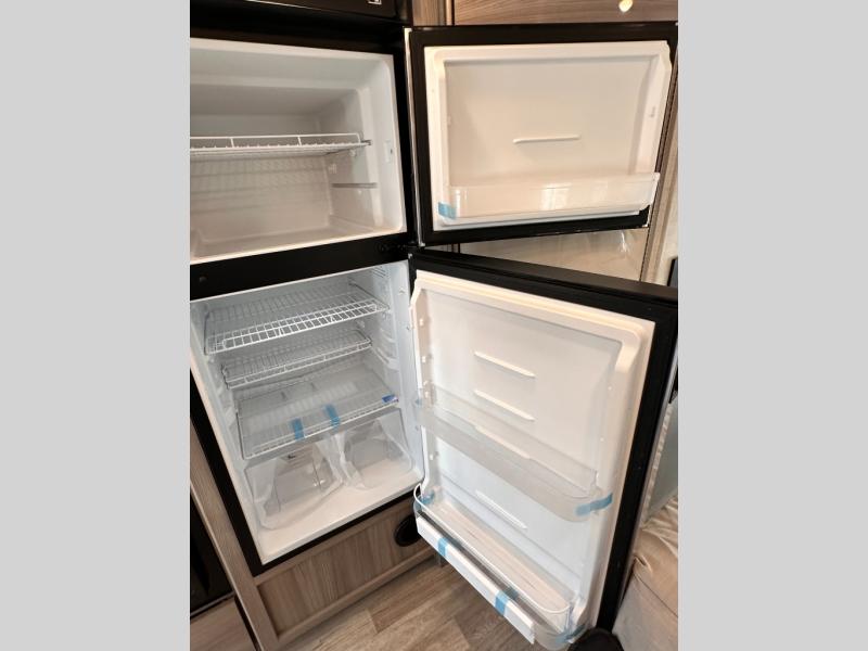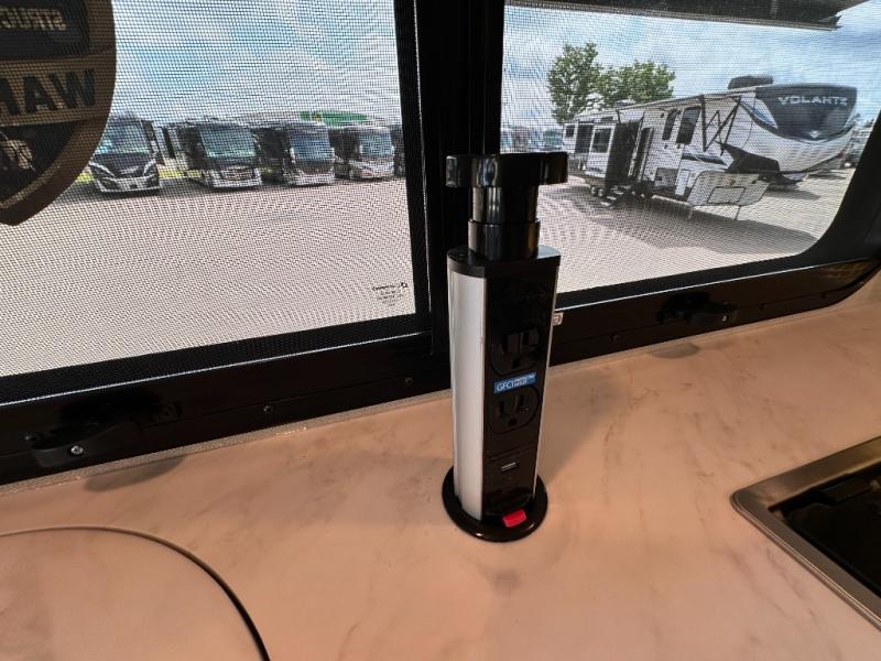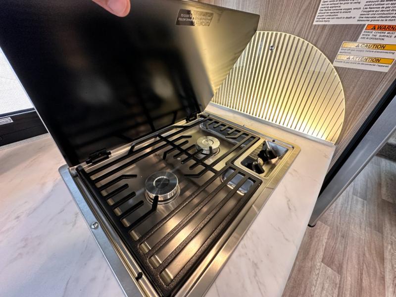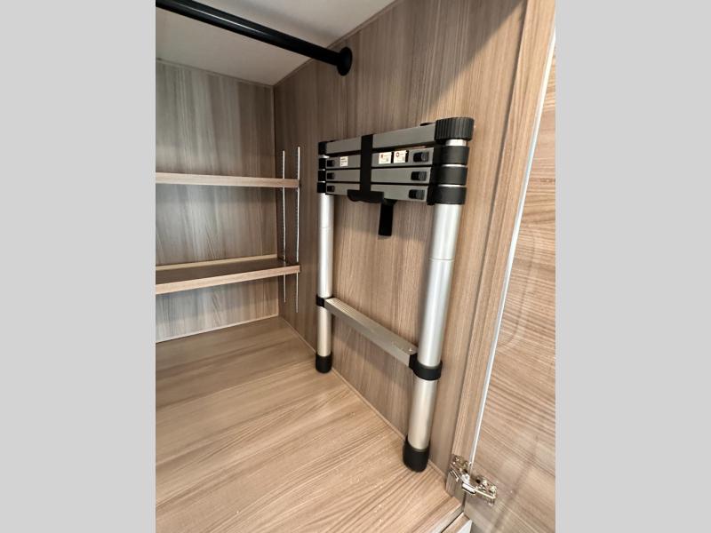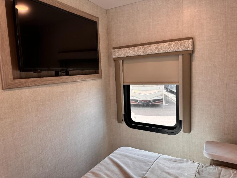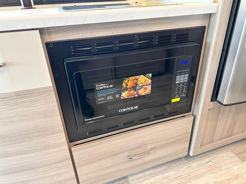 One look at this full-wall slide out coach and you'll be hooked! The swivel captain's seats can become a part of the living area once you're parked, and your guests can sit at the 76" Dream Dinette with storage drawer(s). Prepare lunch on the two burner gas cooktop, or use the convenient convection microwave with an air fryer. You'll find a large closet that can be used for clothes, food, or miscellaneous camp gear, plus there are overhead compartments for even more storage. The cab-over bunk provides additional sleeping space, and you'll enjoy the flip-up queen bed in the bedroom, along with a 32" Smart TV.