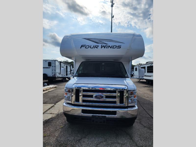 With any Four Winds Class C gas motorhome, you can travel in a trustworthy Ford E-Series chassis with 325HP, or a Chevrolet chassis with 401HP if you choose that option which is available on several models. Each is built with welded sidewall cage construction and a welded tubular aluminum roof, a one-piece fiberglass cap, and includes a slick fiberglass exterior with graphics package for style and years of enjoyment on the open road. Inside, you will enjoy the well-equipped kitchen, the spacious bathroom, the sleeping accommodations and the Winegard ConnecT 2.0 WiFi/4G/TV antenna that allows you to stay connected. With several floorplans to choose from and options to add, you will surely find one that fits your family's needs or your friend's approval. Choose today!
