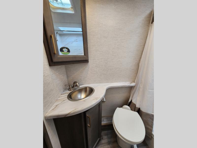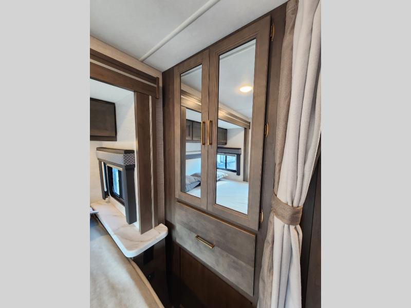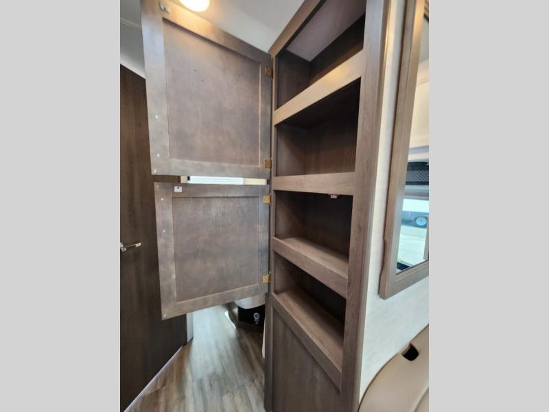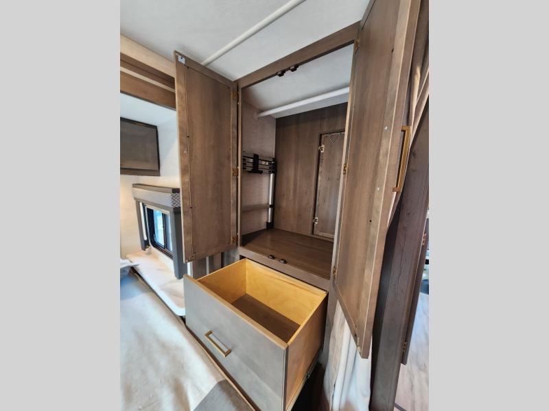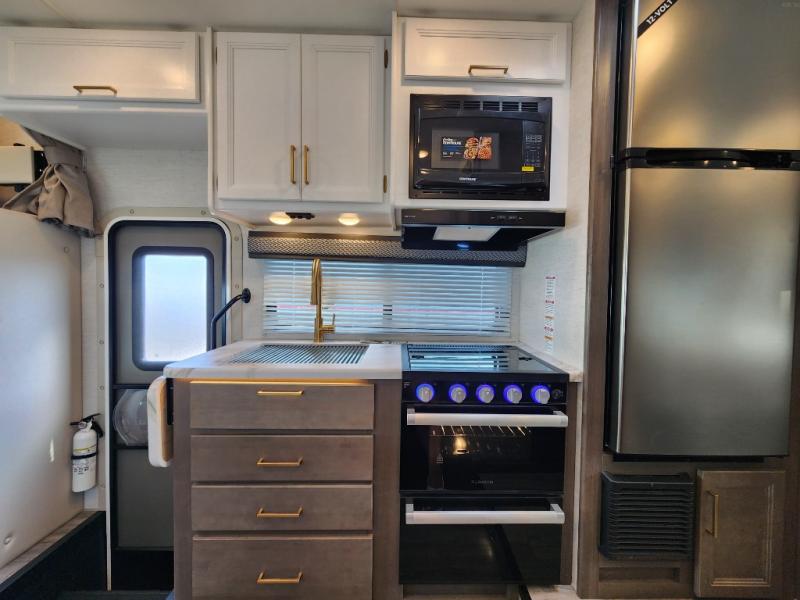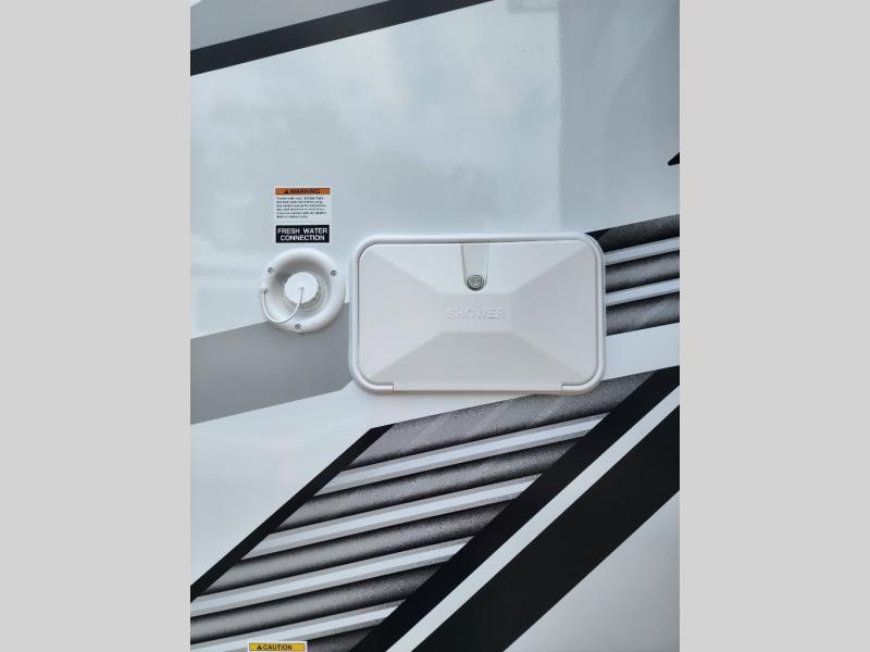 Easily head out for fun at a state park, the lake or your friend's ranch. This coach is easy to maneuver on the road or in town thanks to its compact size, yet has so many conveniences, you might not return home. The front cab over bunk is a perfect sleeping space for guests, the 39" Smart TV allows you to watch shows when you want some inside time, and the dream dinette gives you a place to dine and relax. The cook will love all the kitchen amenities at their fingertips, plus the flip-up countertop extension is super handy. The rear corner bedroom offers a queen bed slide for more floor space, a privacy curtain and a closet, plus the full bathroom is a few steps away. You can also choose to add the optional exterior 32" TV for outdoor fun!