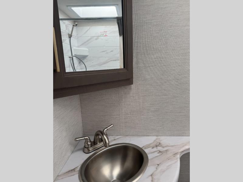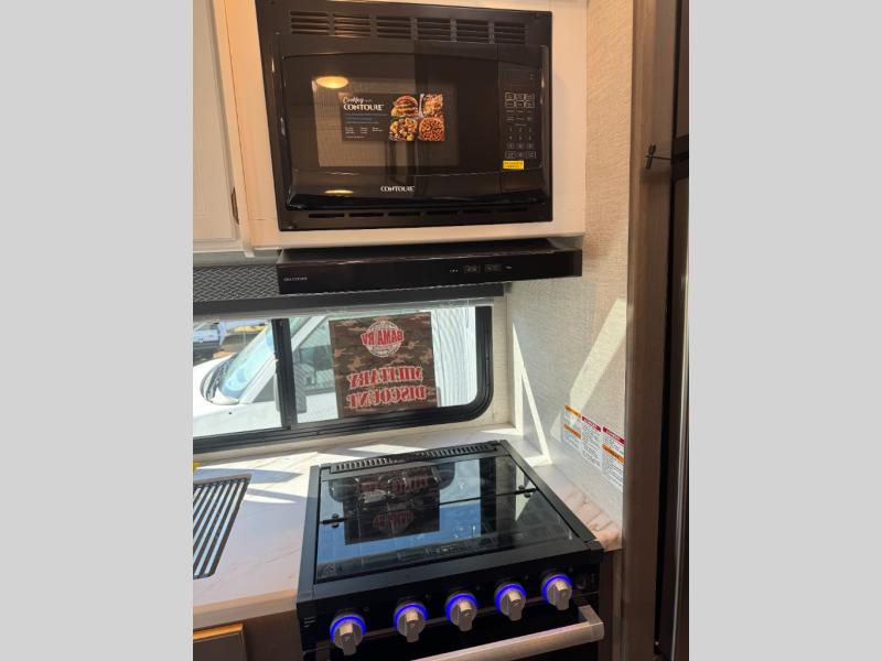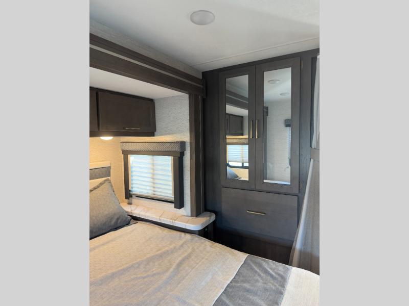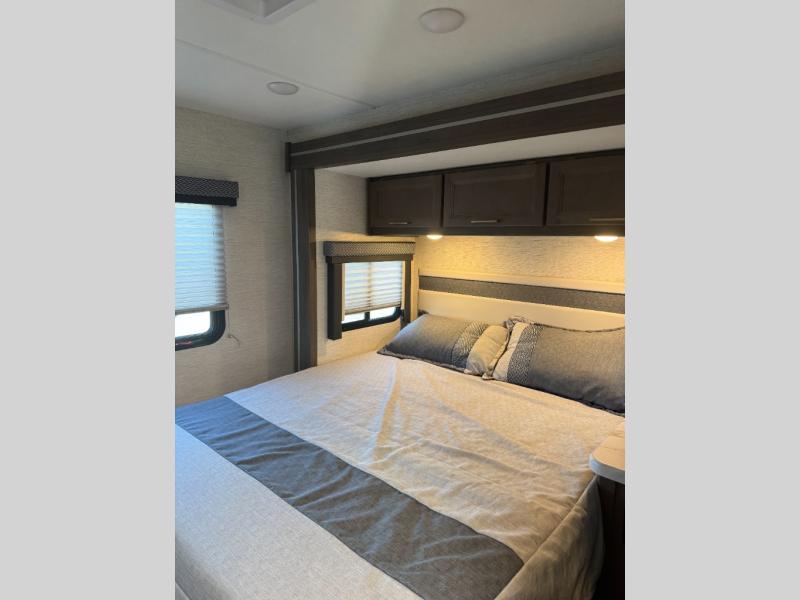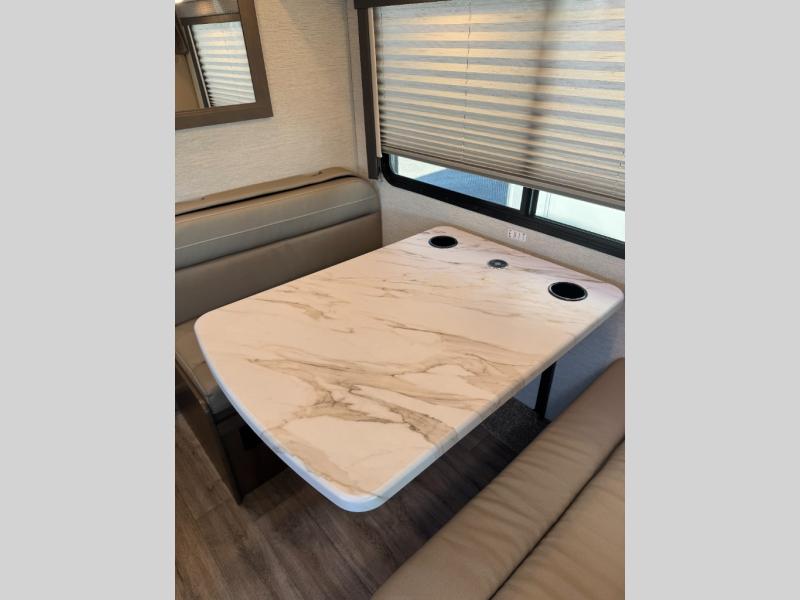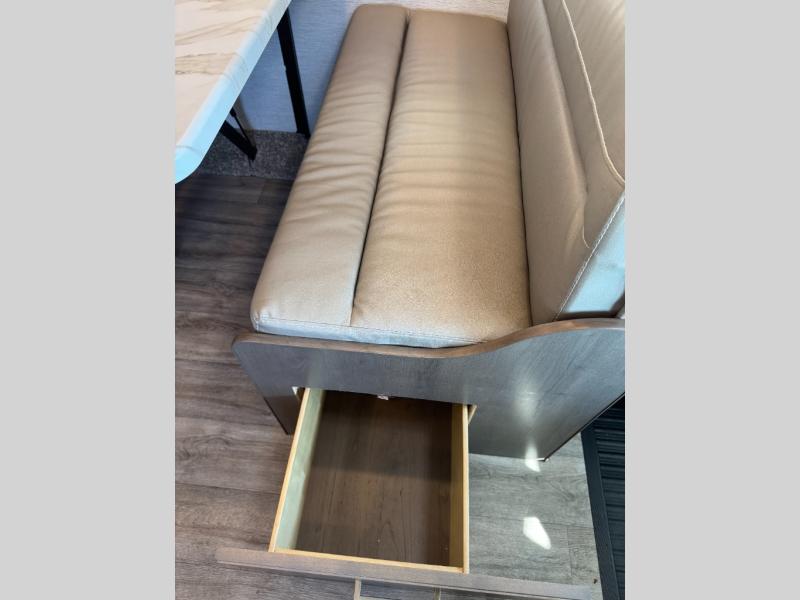 Easily head out for fun at a state park, the lake or your friend's ranch. This coach is easy to maneuver on the road or in town thanks to its compact size, yet has so many conveniences, you might not return home. The front cab over bunk is a perfect sleeping space for guests, the 39" Smart TV allows you to watch shows when you want some inside time, and the dream dinette gives you a place to dine and relax. The cook will love all the kitchen amenities at their fingertips, plus the flip-up countertop extension is super handy. The rear corner bedroom offers a queen bed slide for more floor space, a privacy curtain and a closet, plus the full bathroom is a few steps away.