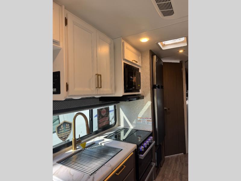 With any Four Winds Class C gas motorhome, you can travel in a trustworthy Ford E-Series chassis with 325HP, or a Chevrolet chassis with 401HP if you choose that option which is available on several models. Each is built with welded sidewall cage construction and a welded tubular aluminum roof, a one-piece fiberglass cap, and includes a slick fiberglass exterior with graphics package for style and years of enjoyment on the open road. Inside, you will enjoy the well-equipped kitchen, the spacious bathroom, the sleeping accommodations and the Winegard ConnecT 2.0 WiFi/4G/TV antenna that allows you to stay connected. With several floorplans to choose from and options to add, you will surely find one that fits your family's needs or your friend's approval. Choose today!