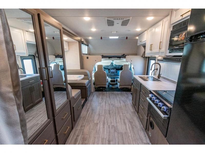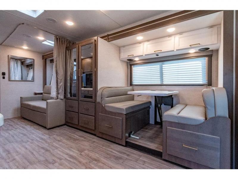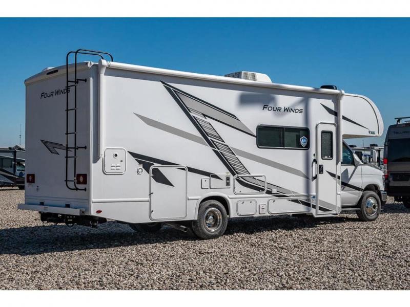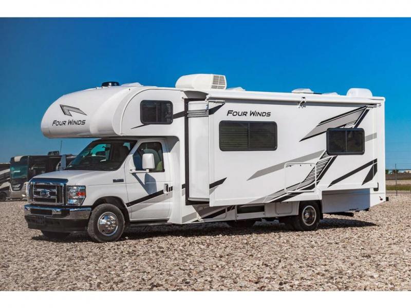 With any Four Winds Class C gas motorhome, you can travel in a trustworthy Ford E-Series chassis with 325HP, or a Chevrolet chassis with 401HP if you choose that option which is available on several models. Each is built with welded sidewall cage construction and a welded tubular aluminum roof, a one-piece fiberglass cap, and includes a slick fiberglass exterior with graphics package for style and years of enjoyment on the open road. Inside, you will enjoy the well-equipped kitchen, the spacious bathroom, the sleeping accommodations and the Winegard ConnecT 2.0 WiFi/4G/TV antenna that allows you to stay connected. With several floorplans to choose from and options to add, you will surely find one that fits your family's needs or your friend's approval. Choose today!