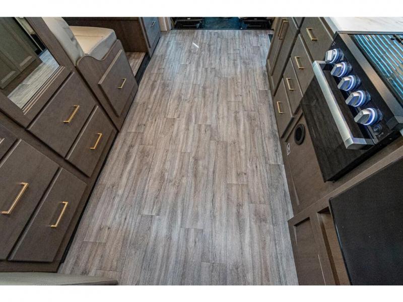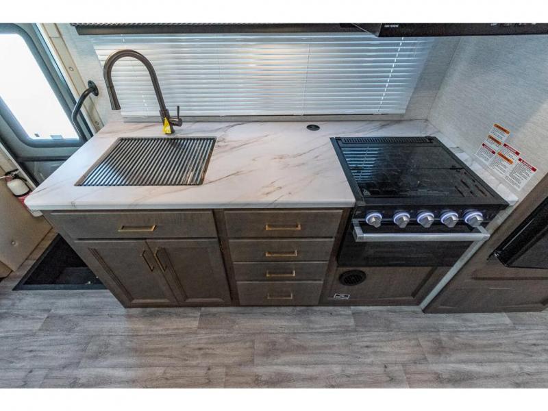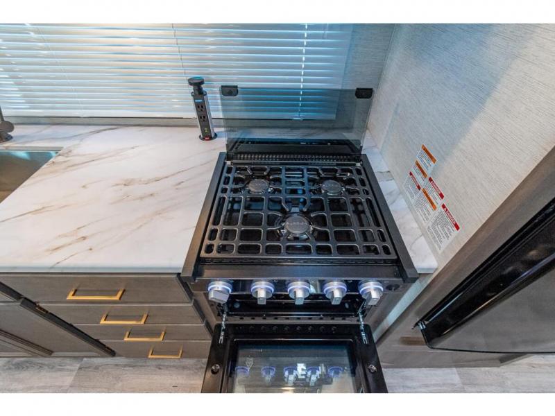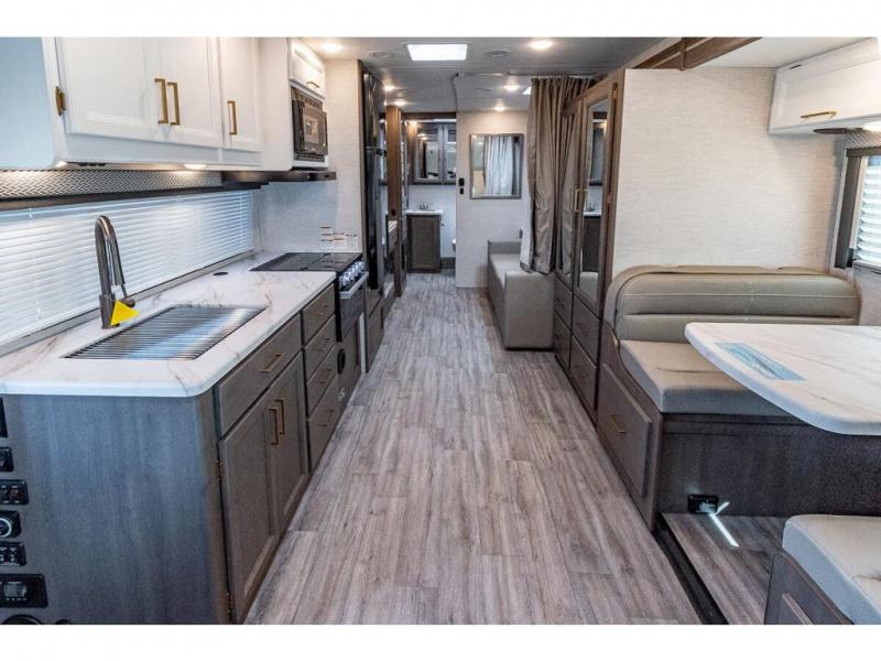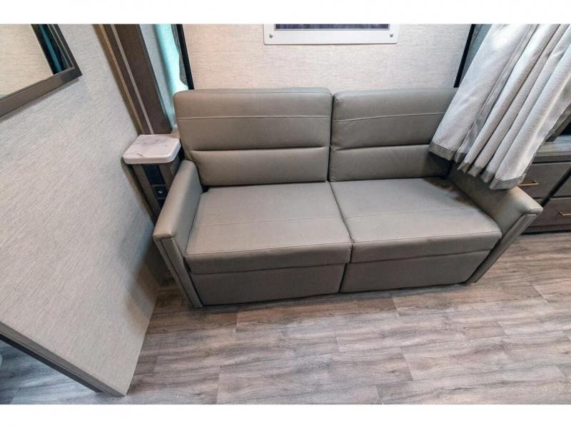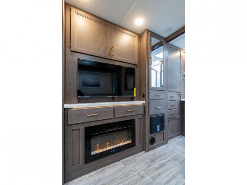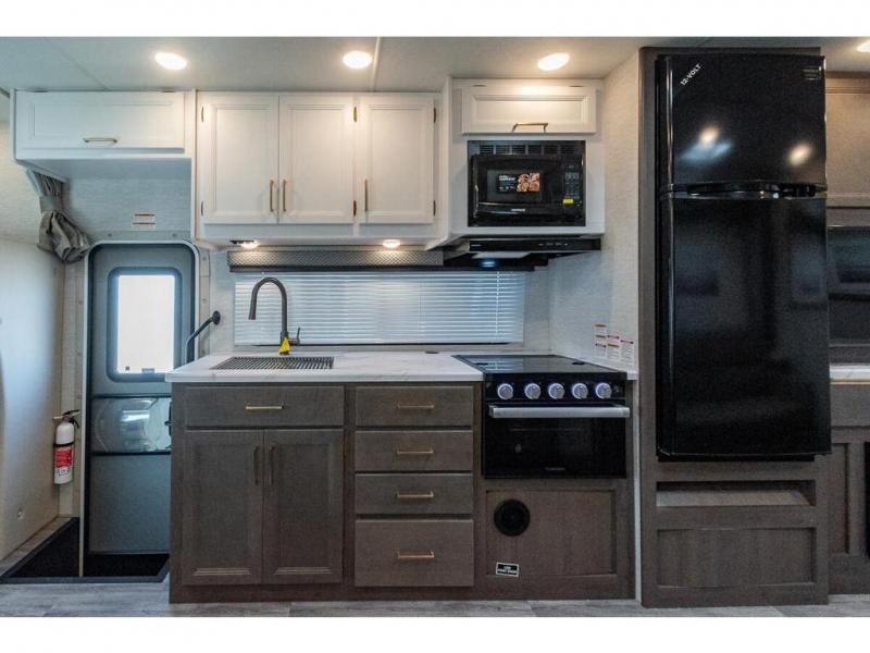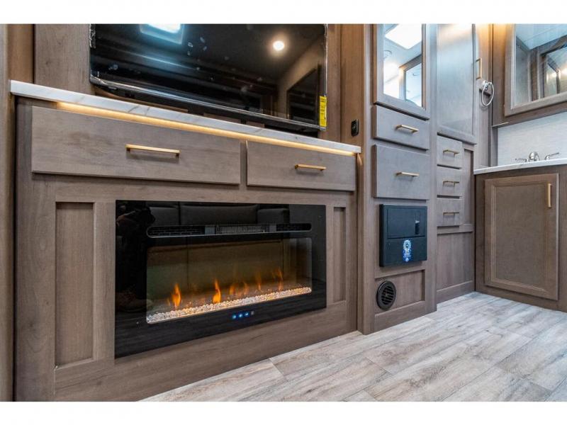 Wherever you decide to roam, you can be sure you'll have comfort at every turn in this spacious coach! There is a dream dinette, two closet, and a sofa with a Murphy bed within the full-wall slide, plus a privacy curtain around the bed if you have guests staying over. A cab-over bunk features a 52" x 96" sleeping area, and everyone can take turns cleaning up in the full rear bath! There is also a fireplace in front of the sofa/Murph bed and a 39" Smart TV for movie nights. In the morning, you can prepare breakfast on the three burner gas cooktop or in the microwave oven, and there is a 12V refrigerator to keep food fresh!