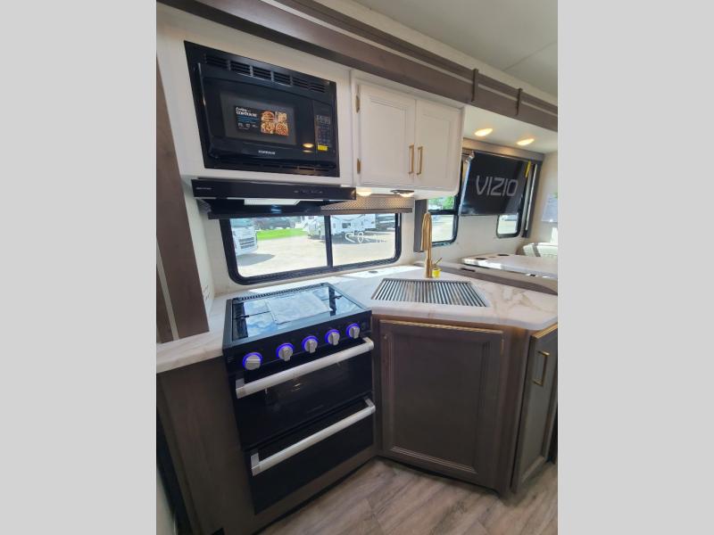 Perfect for a couple or a growing family, this coach will allow you to enjoy inside comforts and outdoor scenery where ever you drive and park! You will have great views out of the many windows when you are indoors, and the power awning offers an outdoor living area protected by the elements when you want some fresh air. The cook will love the large single bowl stainless steel sink with a single handle faucet with a pull-down sprayer when cleaning fruits and veggies, the gas cooktop and microwave when making meals, as well as the 12V refrigerator to hold all the cold items. The slide out creates even more floor space, the furniture offers a place to dine and visit as well as sleep, and the private bedroom with a full bathroom just steps away will complete the deal!
