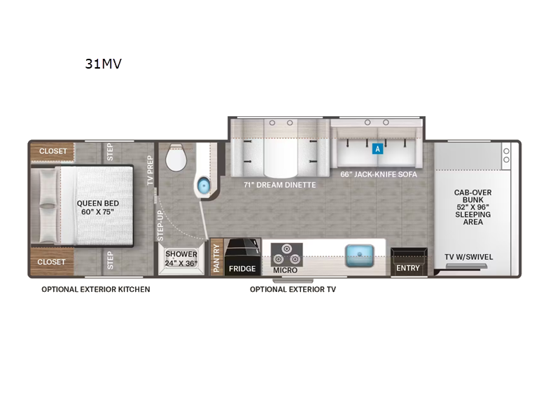 This model with a split bath and a large slide out is perfect for trips across the country. Once you arrive at your destination, prepare lunch on the three burner gas cooktop or use the microwave oven when you're on the go. You can dine at the Dream Dinette after lunch or watch a show on the cab TV before heading out on a trail or two. This model also includes a queen bed in the rear private bedroom, dual closets, and TV prep if you want to add a television. This model also features an optional exterior kitchen and optional exterior TV to expand your outdoor comfort!