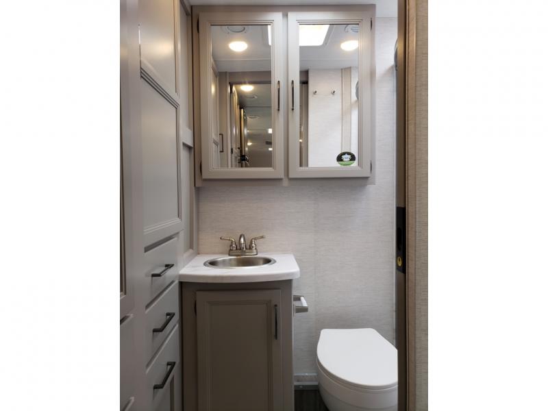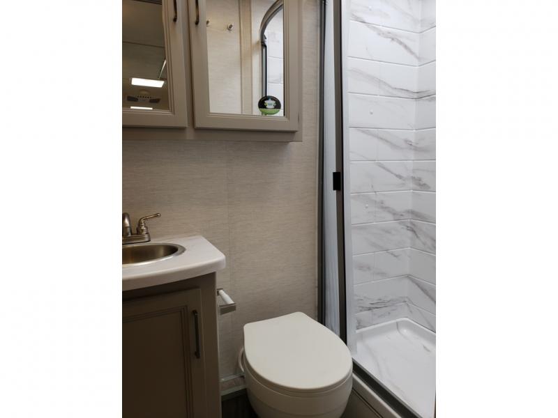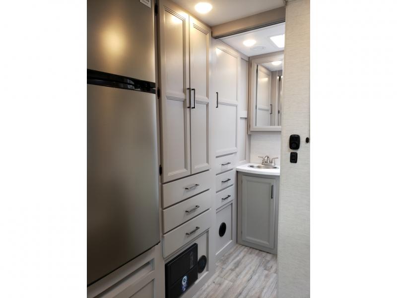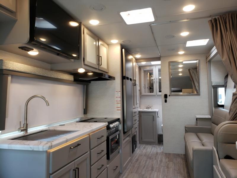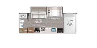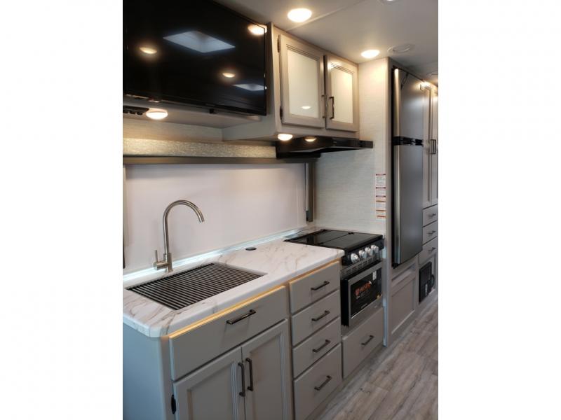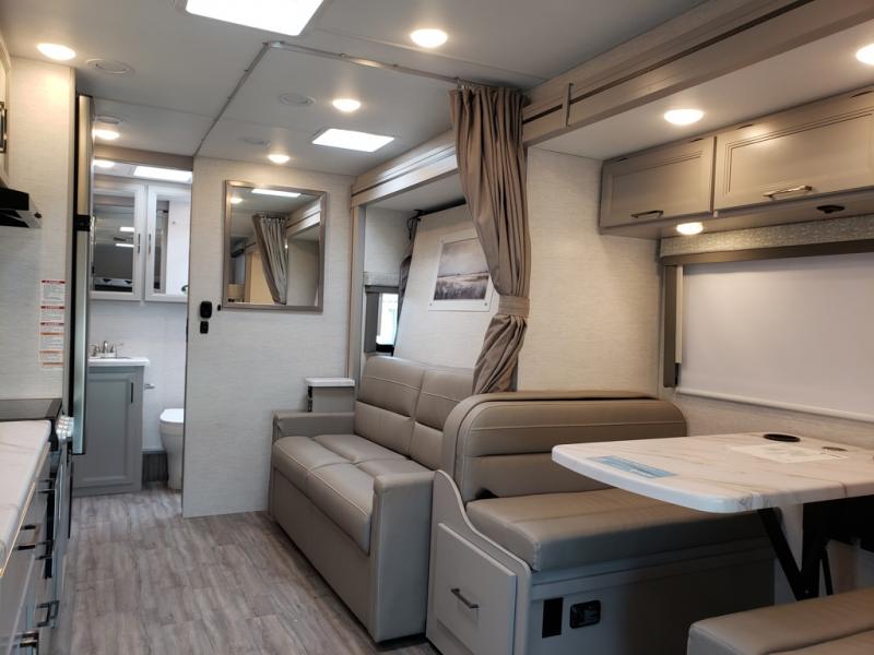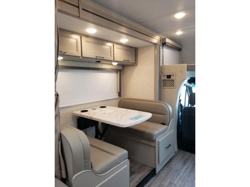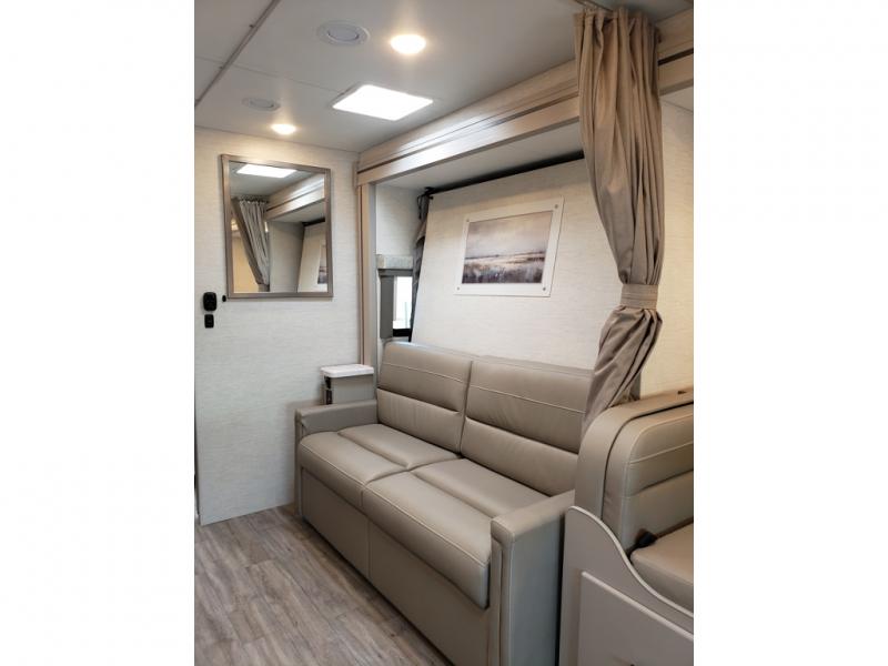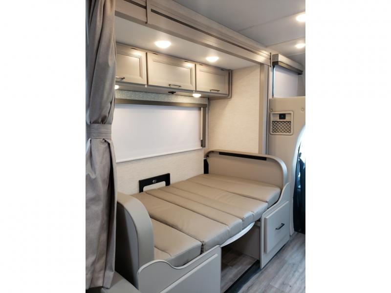 Travel comfortably in this Class C motorhome with a thoughtful layout including a Murphy bed for comfort at night and added floor space during the day. When you close up the Murphy bed you will have a sofa in its place. A 71" Dream Dinette allows for added seating during mealtime and for game playing, and it also can transform into sleeping space at night. Plus, you will have a 52" x 87" cab-over bunk that sleeps two adults or children as well. All will enjoy the full rear bath with a space saving sliding door for privacy. Inside, there is a 24" x 36" shower plus a nice size closet for your clothing. A full kitchen including a three burner cooktop and convection microwave with an air fryer, plus ample counter space for food prep.